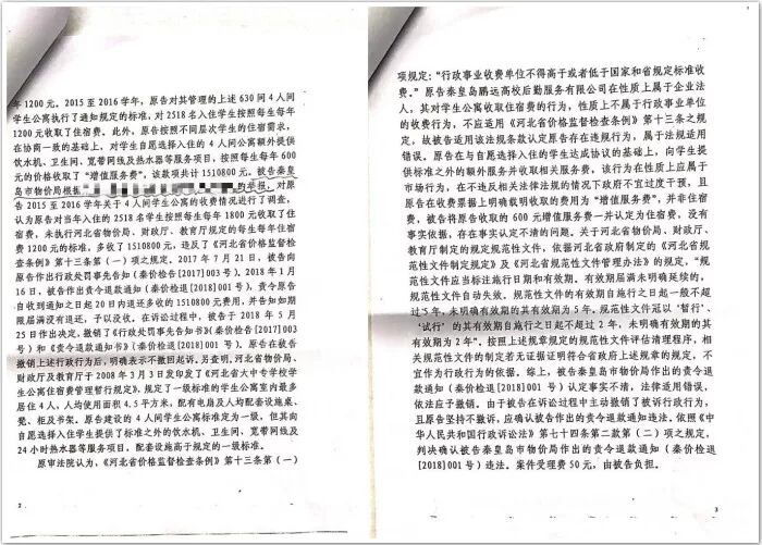 据此,学生认为鹏远公寓涉嫌违规,拒绝缴纳相关费用。经人举报,物价局曾调查2015至2016学年该公寓630间四人间的收费情况,最终责令鹏远公寓的运营方秦皇岛鹏远高校后勤服务有限公司(下称鹏远后勤)退掉住宿费之外的增值服务费150多万(其中每人的增值服务费为600元),两者对簿公堂,但最终鹏远后勤以胜诉告终。