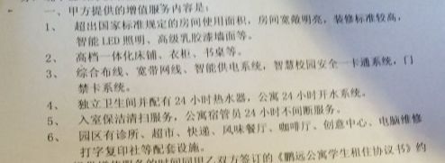 动辄数千乃至上万的增值服务费被认为是变相提高住宿费。据一张被认为是鹏远公寓提供的增值服务内容的截图显示,对方将提供的包括超出国家标准的面积、相关设备如LED灯,独立卫生间、宽带等。但芥末堆未在李忠签订的租赁协议里并未找到上述增值服务内容及相应费用。