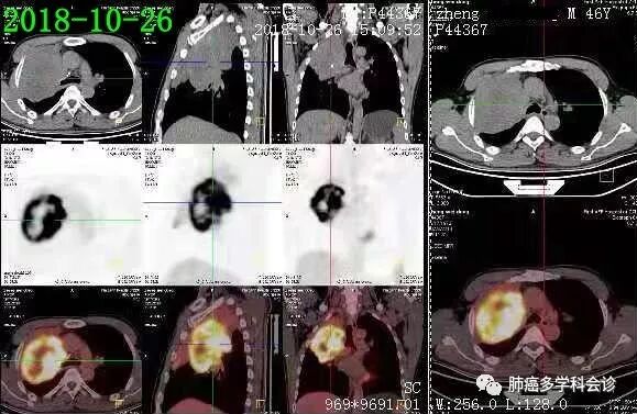 PET-CT示(2018-10-28):右肺上叶近肺门软组织肿块代谢不均匀活跃,远侧肺组织不张;右侧锁骨上/下及纵隔(2R)和4L 小淋巴结淋巴结代谢稍活跃。