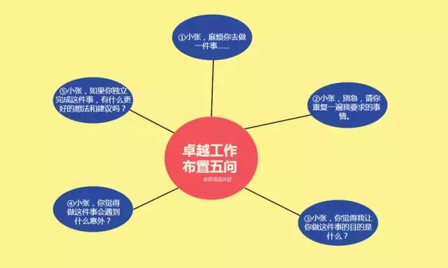 卓越管理者的工作布置五问 ①小张,麻烦你去做一件事...... ②小张,别急,请你重复一遍我要求的事情。 ③小张,你觉得我让你做这件事的目的是什么? ④小张,你觉得做这件事会遇到什么意外?什么情况你要向我汇报?什么情况你可以自行解决? ⑤小张,如果你自己独立来完成这件事,有什么更好的想法和建议吗?