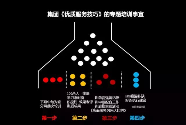 第一步:根据培训部的讲师行事安排,建议安排在下月中旬为宜,可分两批次轮训。 第二步:鉴于参训人数较多(100人左右),可能会涉及店面人员的排班、课程学习准时度、会场参与积极性、学习效果如何考评、训后成果的有效转化等等问题。 第三步:针对可能出现的上述问题,需要各大区经理,提前做好店面高低峰人员安排、训前强调此次学习的意义及纪律性,训中课程助教要做好各项配合工作,训后会推行《店面服务风采大比拼》实践活动。 第四步:向HRD请示,综上所述,是否还有相关遗漏点或好的建议。 最终的结果是,HRD听完频频点头,略微补充了下,表示非常认同。