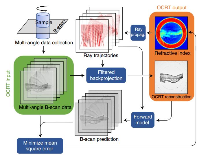 近日,美国杜克大学Joseph A. Izatt 等人开发了光学相干折射层析成像(OCRT)技术,该技术将轴向分辨率拓展到横向分辨率,从具有角分集的多幅常规图像中合成了无畸变的截面图像。在校正由折射引起的畸变以构建OCT图像时,OCRT还实现了空间分辨率的折射率成像。在组织超微结构成像方面,横向分辨率提高了三倍,同时在一定程度上抑制了相干斑点的生成。总之,OCRT是一种利用多角度OCT图像计算得到增强分辨率重建的技术;而这对于传统的OCT来说是无法实现的,此外,研究人员已在各种生物样品中证明了OCRT相较于OCT有很大的优势,并且发现在OCRT重建过程中有一些超微结构看的很明显,但在传统的OCT图像中却缺失了。随着光学设计的进一步优化,将角分集纳入临床仪器的设计中,与传统的OCT相比,OCRT可以作为一种新型增强的技术得到广泛应用。相关研究工作发表在《Nature Photonics》上。