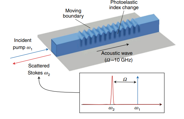 受激布里渊散射(SBS)是一种相干光声耦合过程,在激光物理和非线性光学领域有着广泛的应用。布里渊相互作用产生三阶光学非线性,其强度经常能够高于Kerr和Raman相互作用几个量级。布里渊散射相互作用源自GHz频率范围内的光场和声子之间的耦合,这种相互作用还可以被应用于实现新的激光光源、弹性测量、精密光谱等。此外,产生布里渊效应的光声耦合机制同时也可以产生线性声光相互作用,这是现代声光信号处理技术的基础。以往的布里渊散射往往局限于几十米长光纤实验中,具有固定的增益光谱。然而在过去的十年间,基于新型波导和光学集成平台的布里渊相互作用取得了长足的发展。布里渊增益能够成功的在光子晶体光纤、微米级波导边界等器件中成功实现。