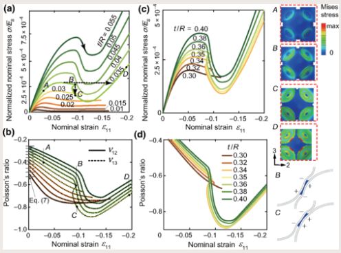 杨氏模量(E),剪切模量(G),体积模量(K)和泊松比(ν)是表征材料机械性能的基本材料参数。常规材料具有正材料参数,而超构材料则具有负参数。具有负泊松比的材料(拉胀材料)在压缩时横向收缩,而具有负刚度的材料在与施加的力相反的方向上变形。负材料参数不仅因其丰富的物理特性而且还因其替代应用和出色的机械性能而备受关注。例如,拉胀材料可以生产具有无界剪切的体积模量和高耐久性的复合材料。另一方面,负刚度材料可以提供高能量吸收,并产生具有无界阻尼和无界刚度的复合材料。