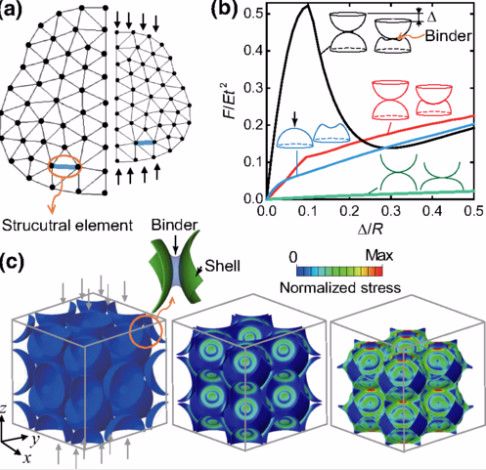 近日,来自State University of New York at Stony Brook的Lifeng Wang研究小组报告了一种三重不稳定性触发的机械超构材料,它同时具有负刚度,负体积模量和负泊松比。该超构材料是粘合剂-壳元素的周期性排列。结合数值模拟和微观力学分析,表明薄球壳在压缩下向内凹陷,这导致负泊松比。基于Riks方法的模拟预测了穿透不稳定性,揭示了超构材料表现出负增量刚度。负体积模量是负刚度和负泊松比的结果。有趣的是,增量刚度和增量泊松比在回弹发生时在位移控制载荷下接近负无穷大。进一步表明,三重负超构材料可以满足强椭圆率条件,提供一种机制,即使在发生材料软化时也能防止形成局部变形带。所提出的三重负超构材料也可以用作极端阻尼复合材料,极端刚性复合材料和机械致动器等应用的结构元件。相关研究发表在杂志《Physical Review Applied》上。