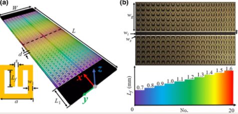 大多数先前的研究工作可以归类为色散工程,其中具有定制色散特性的波导是使不同波长的波在期望位置停止的关键。近日,来自Southeast University的Zhixia Xu研究小组提出了一种不同的策略,抑制不同位置的不同频率的反射和约束波来实现宽带彩虹陷阱,在微波波段报告了梯度超构曲面设计,作为实现“彩虹陷阱”目标的优雅方法,可以用于存储涉及波定位和吸收现象的波。纵向放置的共面波导在两侧加载有梯度表面,其中开环谐振器(SRR)是基本单元。沿横向排列相同的SRR以建立磁感应通道。不同频率的波在表面中的不同位置处耦合到相应的SRR。具有长振荡寿命的谐振陷阱增强了由材料的固有损耗引起的吸收,从而抑制了反射。模拟和测量均验证了“彩虹陷阱”的存在。所提出的策略增强了波与物质之间的相互作用,为进一步的组件设计开辟了道路,包括吸收滤波器,多路复用器和缓冲器。相关研究发表在杂志《Physical Review Applied》上。