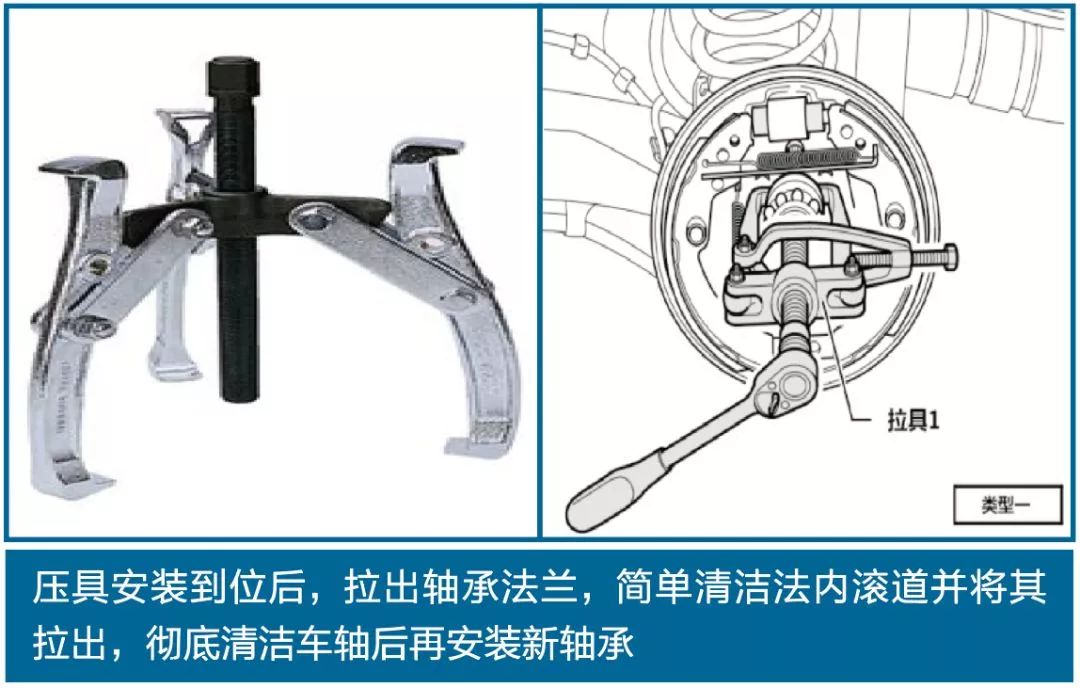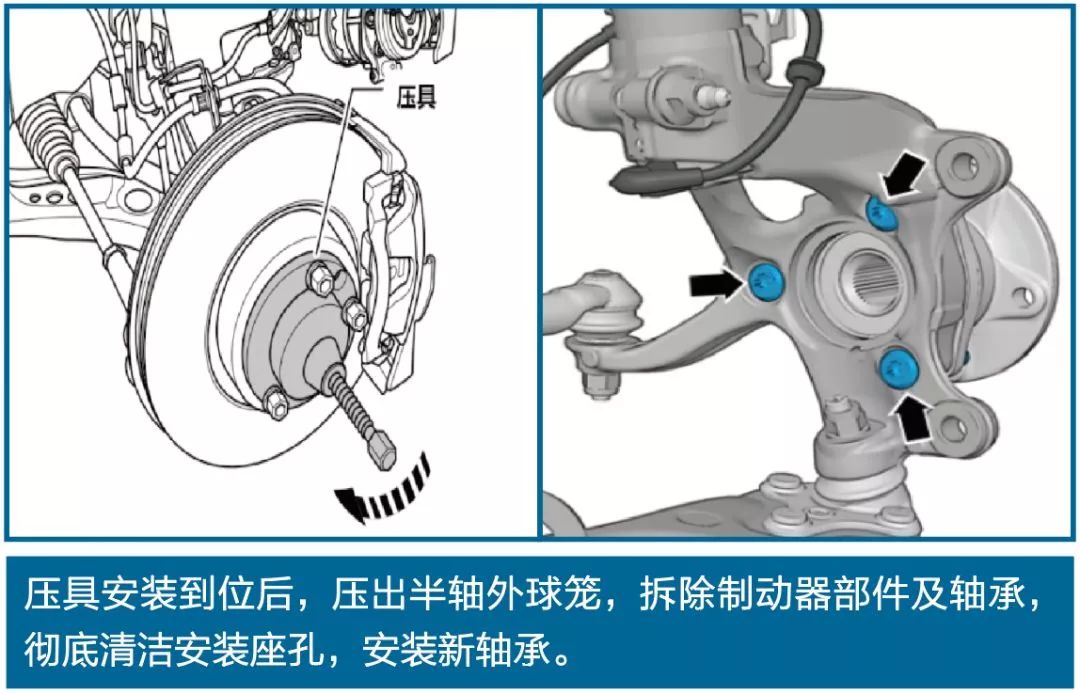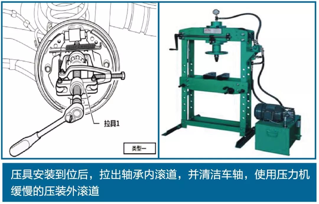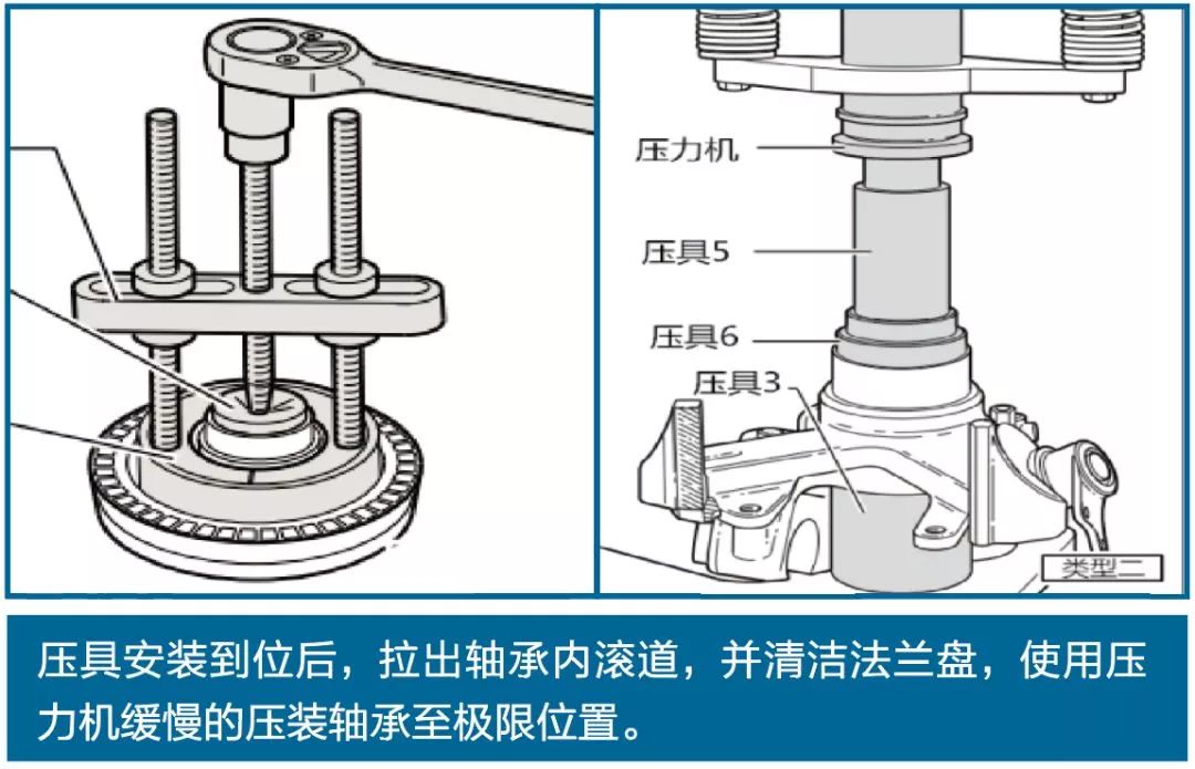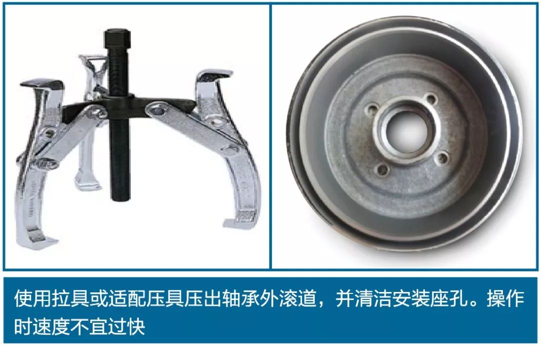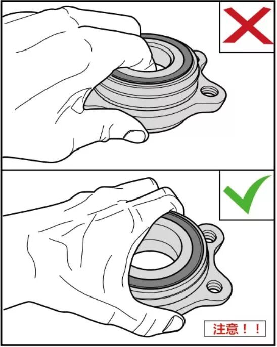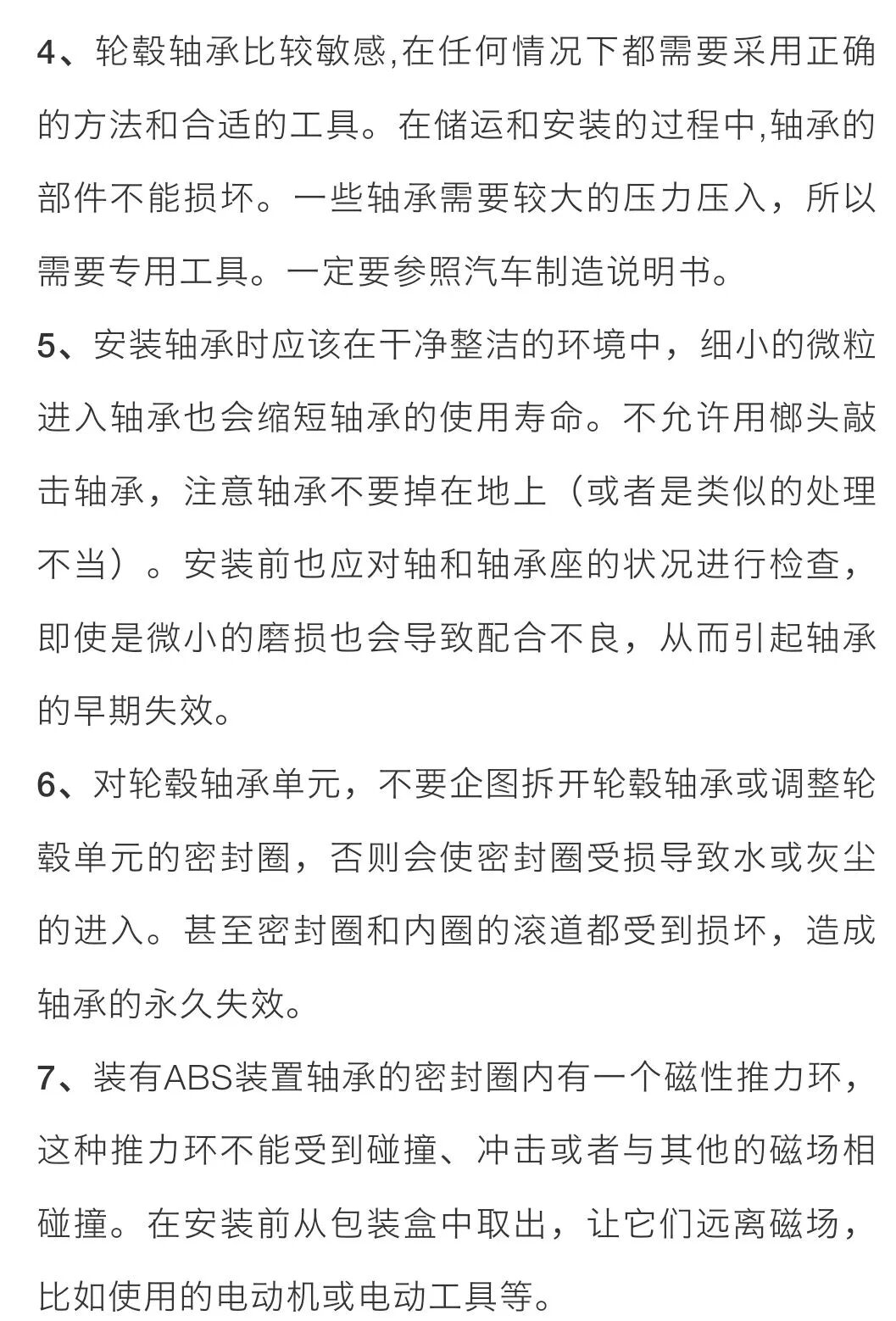 注意事项:选用合适的压具安装轴承。压装时确保轴承座清洁并充分润滑。严格按照车型维修手册对轴承螺栓紧固,否则会导致车轮无法转动或轴承损坏。
