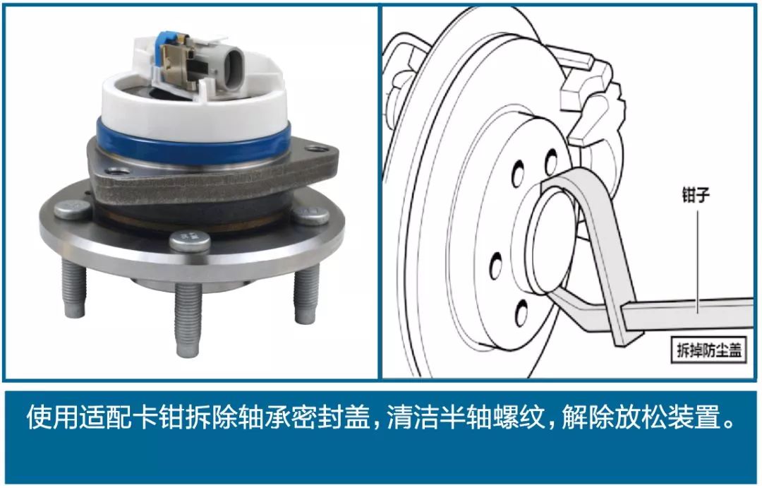 注意事项:严格按照车型维修手册对半轴螺栓紧固,压装时确保轴承座清洁并充分润滑,不要遗忘卡簧,否则会产生严重维修事故。