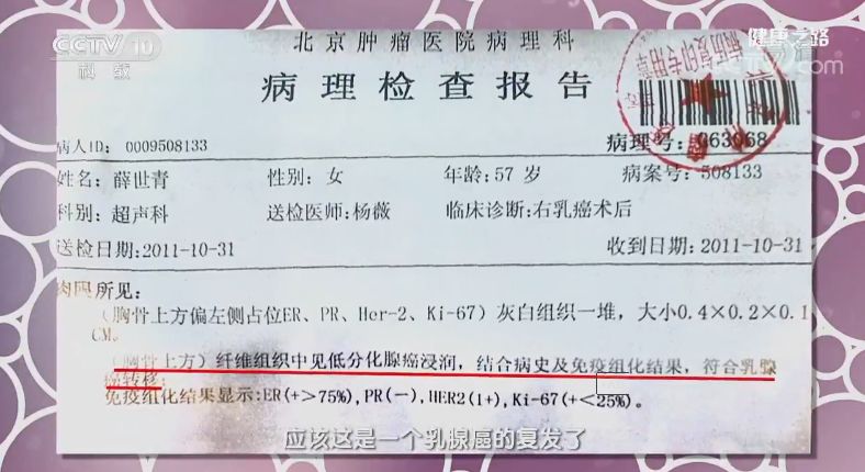 对此,薛阿姨的主治医师,北京大学肿瘤医院乳腺癌预防治疗中心的卫燕主任解释说:“我们现在认为,乳腺癌是一个在发现时就有可能在其他地方转移的一种病变。所以术前用药是很重要的,只是在当时那个时代,很难发现潜在的癌细胞。”