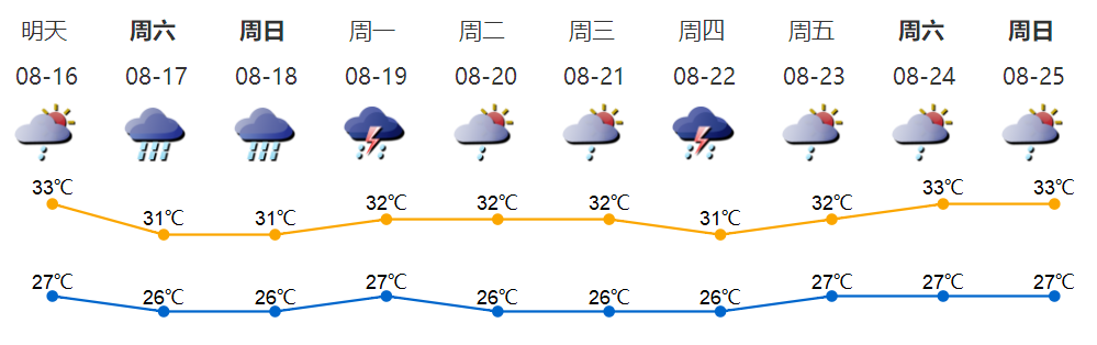 16日有雷阵雨,周末(17-18日)局部有暴雨:16日有雷阵雨局部大雨,雷雨时短时阵风可达7级左右,最高气温32-33℃;17-18日局部有暴雨,19-21日多云为主,间中有阵雨或雷雨。