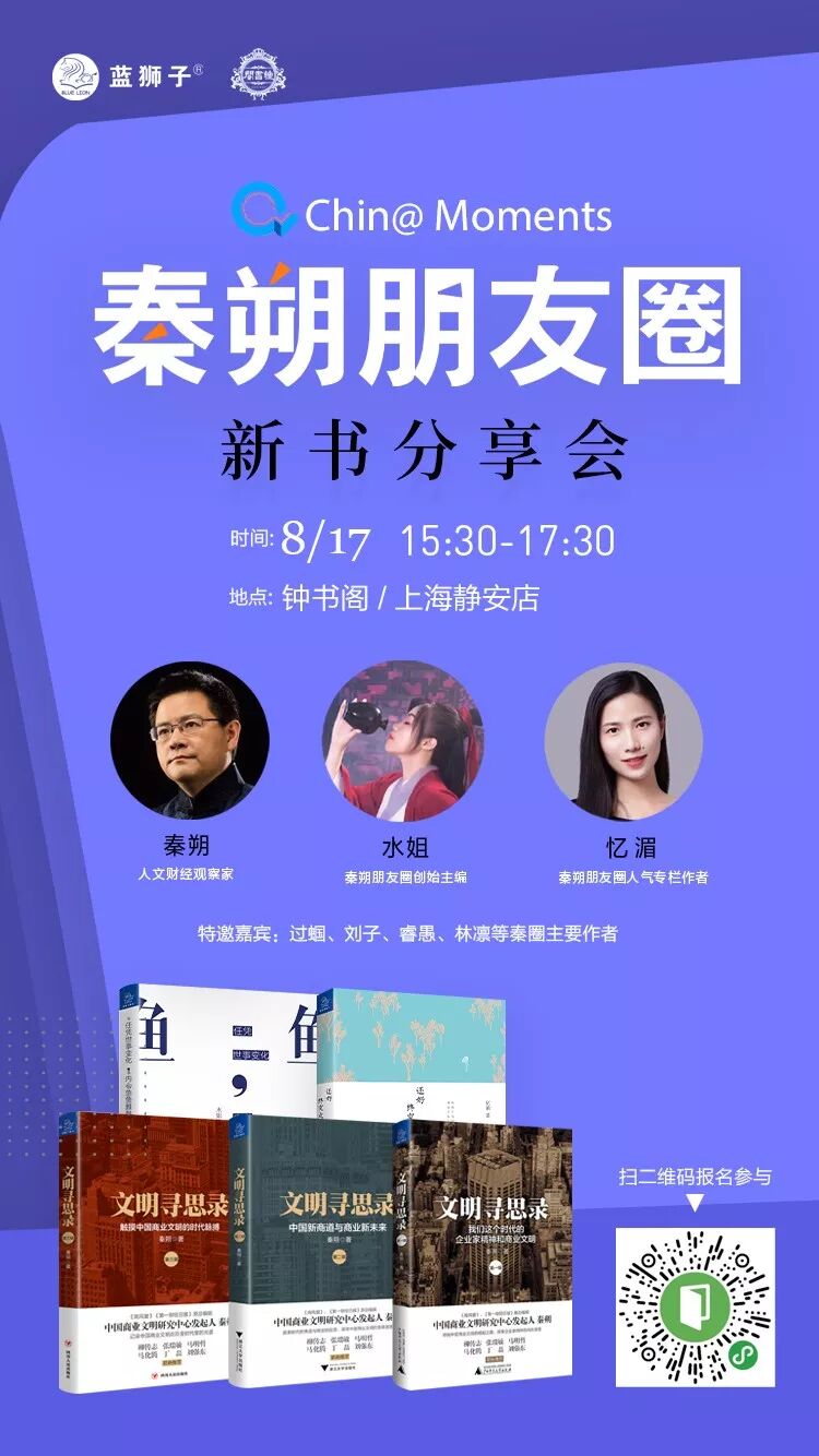 秦圈一年一度的会客将于8月17日15:30在上海钟书阁·静安店进行,欢迎你的到来,秦朔、水姐、忆湄与你分享文化、经济、个人成长等方面的心得。