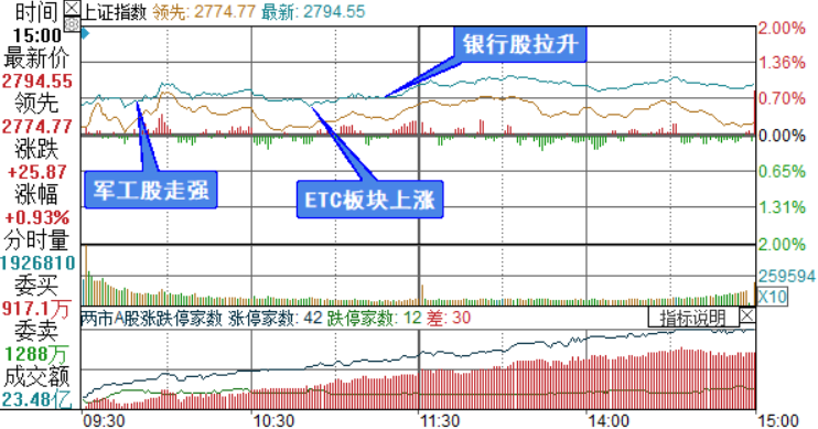 截至沪深股市全天收盘,上证综指收报2794.55点,上涨25.87点,涨幅0.93%,成交额1781.56亿元;深证成指收报8919.28点,上涨104.54点,涨幅1.19%,成交额1890.27亿元;创业板指收报1522.97点,上涨22.72点,涨幅1.51%,成交额653.43亿元。