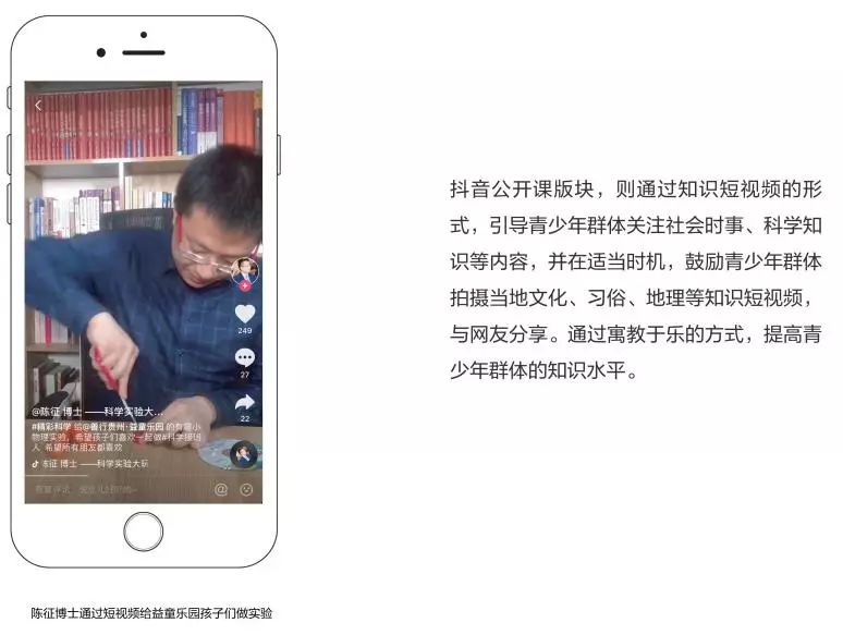 以知识传播为例,抖音平台上拥有大量知识类短视频,涉及多个领域、多种类型,通过短视频的形式将知识做生动化呈现,知识学习的门槛降低,知识传播取得更好效果。