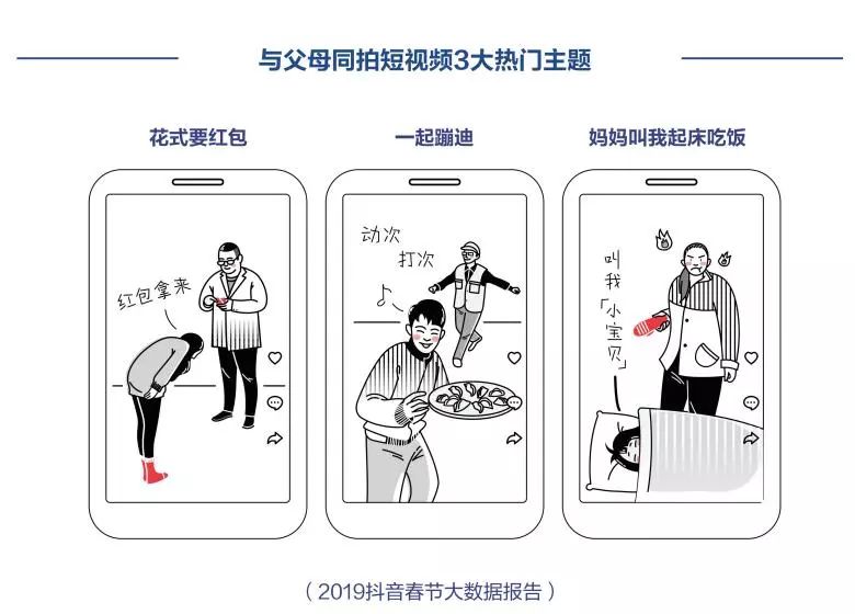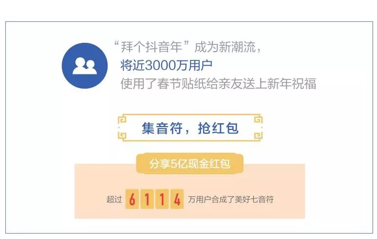 短视频成为中国传统节日传递祝福的新形式。2019年农历春节期间,短视频化身为拜年使者——有近3000万用户使用春节贴纸,通过抖音拜年;超过6114万用户参与“集音符,抢红包”活动。