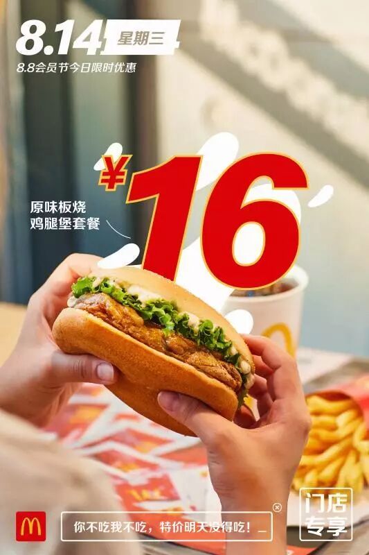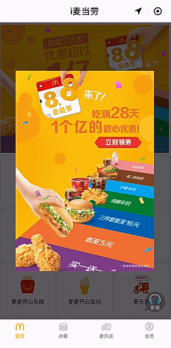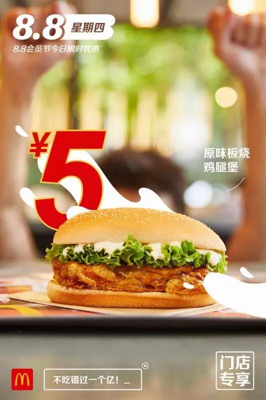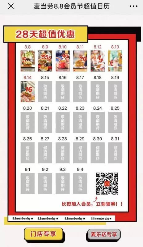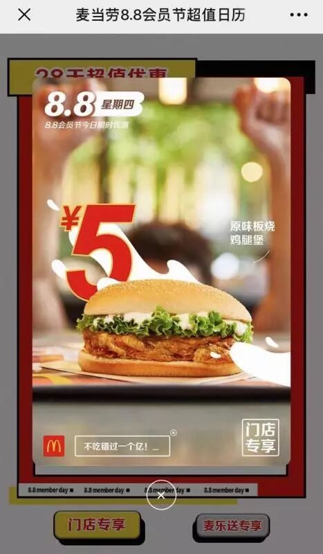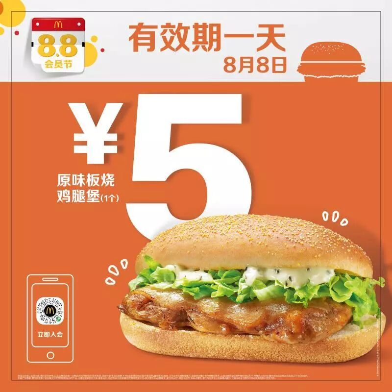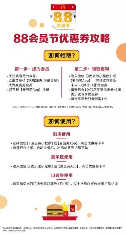 - 来不及解释了,先领一周14张券!(꒪Д꒪)ノ 最近这个消息传疯了: “麦当劳8.8会员节又来了?都上微博热搜了!!” “天哪我的5元板烧!今年一定早点冲鸭!” “嗨翻28天,据说优惠一个亿?!”