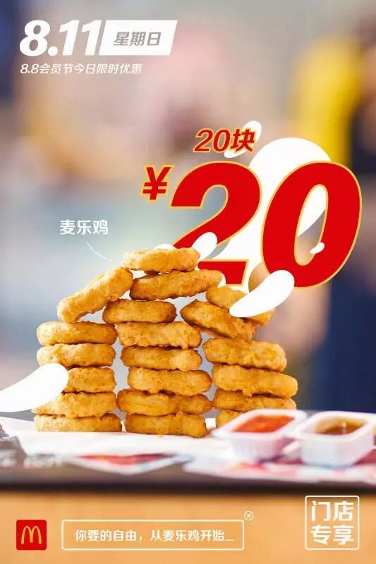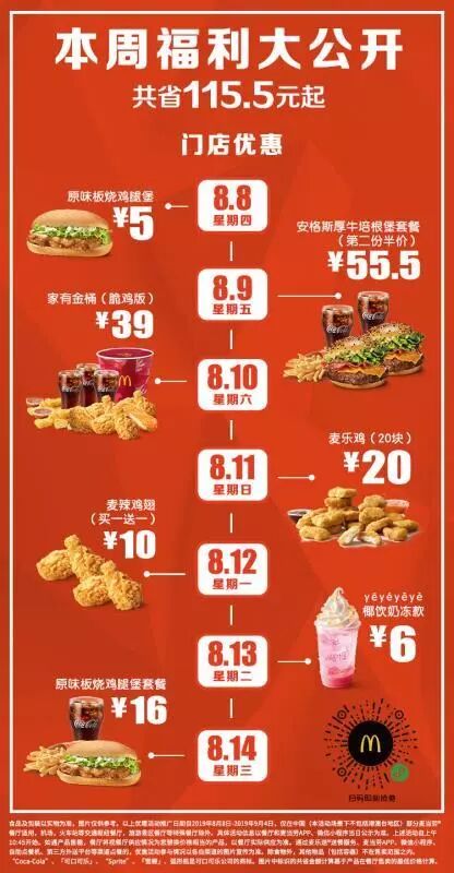 食品及包装以实物为准,图片仅供参考。以上优惠活动推广日期自2019年8月8日-2019年9月4日,仅在中国(本活动场景下不包括港澳台地区)部分麦当劳餐厅适用,机场,火车站等交通枢纽餐厅,旅游景区餐厅等特殊餐厅除外。具体活动信息以餐厅和麦当劳APP、微信小程序当日公示为准。上述活动自上午10:45开始。如遇产品售罄,餐厅将视餐厅供应情况为您替换价格相当的产品,以餐厅实际供应为准。通过麦乐送送餐服务、麦当劳APP、微信小程序、自助点餐机、第三方外送平台等渠道点餐的,优惠活动参与情况以各自渠道的图片宣传为准。除食物外,其他物品(包括容器)不在售卖范围之内。“Coca-Cola”、「可口可乐」、“Sprite”、「雪碧」、弧形瓶是可口可乐公司的商标。图片中标识的共省金额计算基于产品在餐厅售卖的最低价格计算。