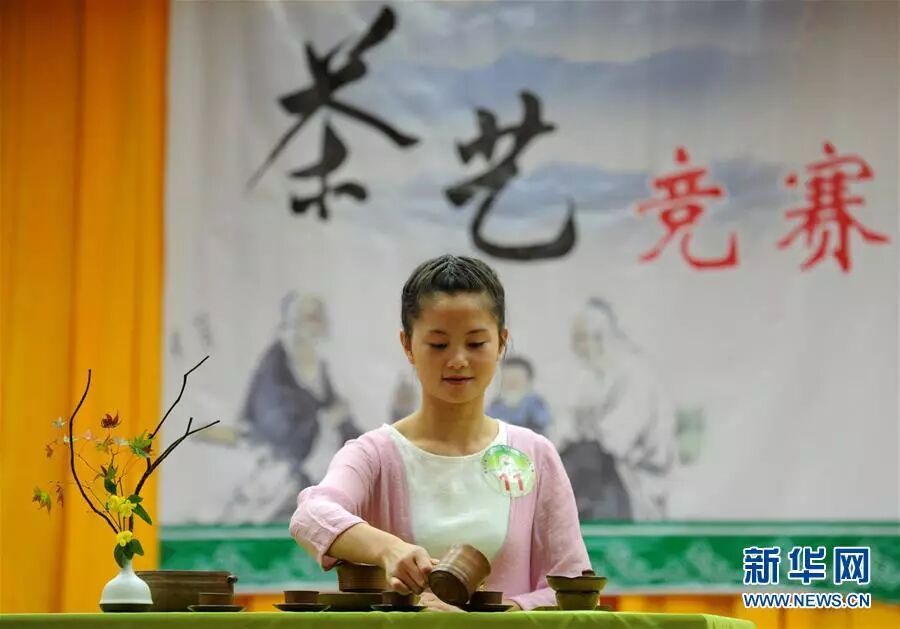 参赛选手在贵阳市第二届技能之星竞技大赛决赛茶艺展示比赛中(2015年11月17日摄)。大赛吸引5000余名来自贵州省中、高等职业院校的学生参加。新华社记者 陶亮 摄