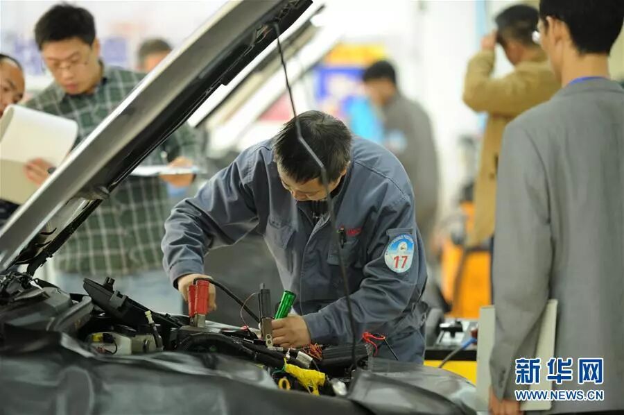 参赛选手在贵阳市第二届技能之星竞技大赛决赛汽车维修项目比赛中(2015年11月17日摄)。大赛吸引5000余名来自贵州省中、高等职业院校的学生参加。新华社记者 陶亮 摄