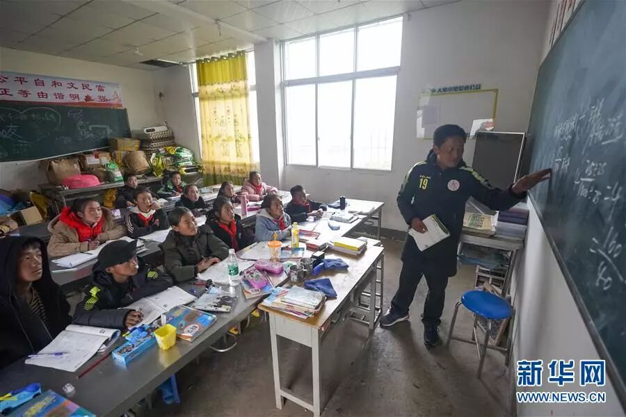 瓦吾小学教师曲比史古(右一)在给五年级学生上数学课(5月27日摄)。新华社记者 沈伯韩 摄
