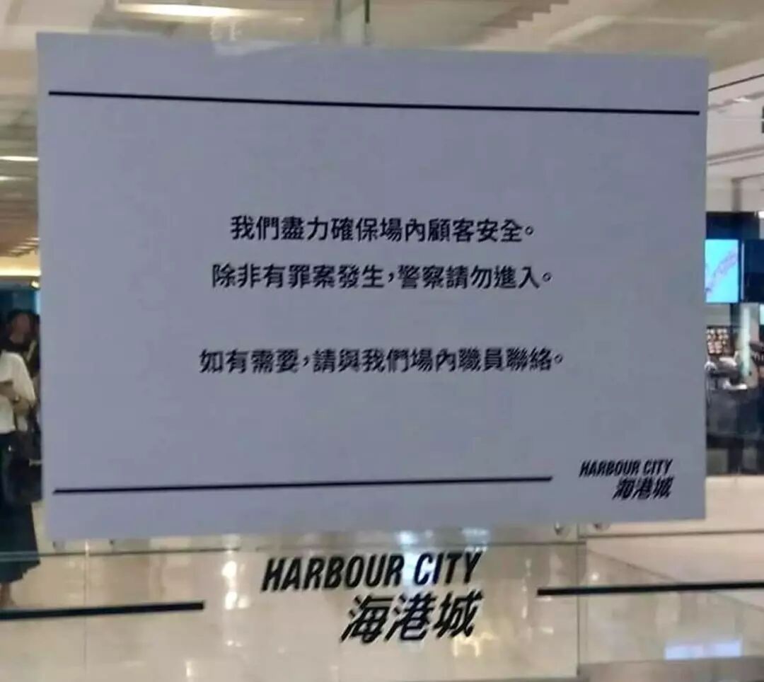 “有关告示符合海港城物业管理处的一贯政策,如非有罪案发生,毋须劳烦警察,商场的保安会处理有关情况。” 我们大家都希望社会气氛尽快回复和谐,共同努力避免引发任何冲突,谢谢大家理解。”