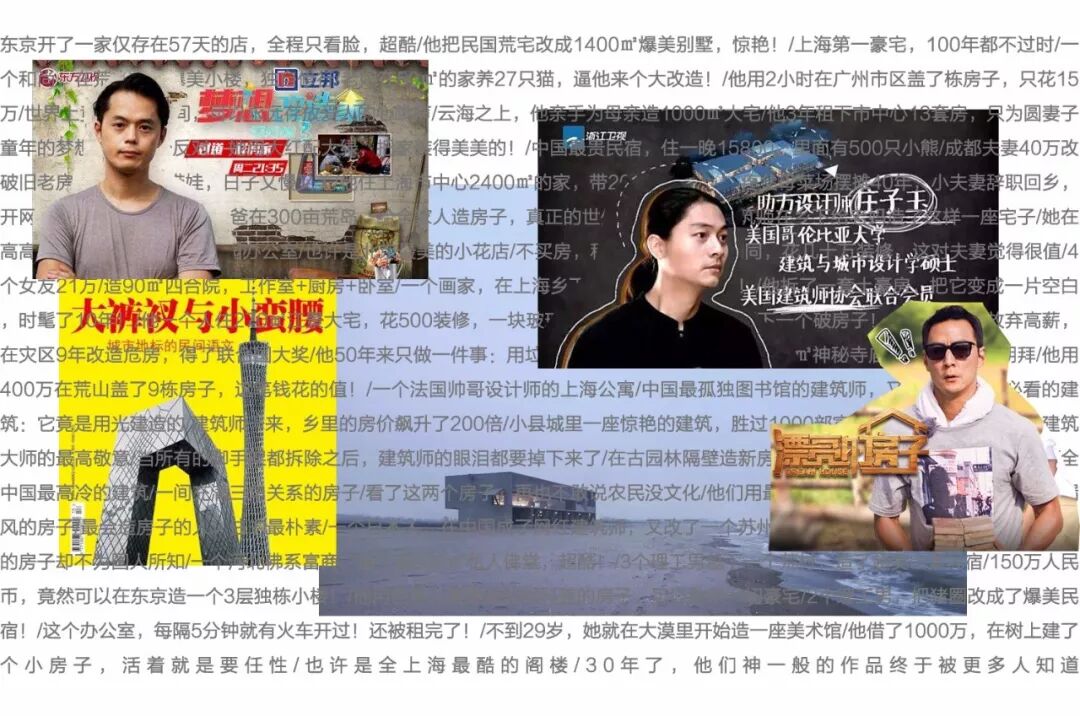 带着这样的问题,我们寻找到视野范围之内的8家大众媒体品牌和数位参与大众传播的建筑人,试图给出多角度的回答。其中包括出版“建筑史诗”书系的图书品牌“读库”,拍摄“中国最孤独图书馆”的“一条”视频,策划“中国城市十大败笔”专题的杂志《新周刊》,发布“中国城市商业魅力排行榜”的数据新闻媒体“新一线城市研究所”,前后邀请过44位建筑人发表演讲的新型媒体平台“一席”;以及参加过两季“梦想改造家”的建筑设计师青山周平,“知乎”论坛建筑内容优秀答者袁牧,面向大众讲故事的互联网创业团队AssBook……