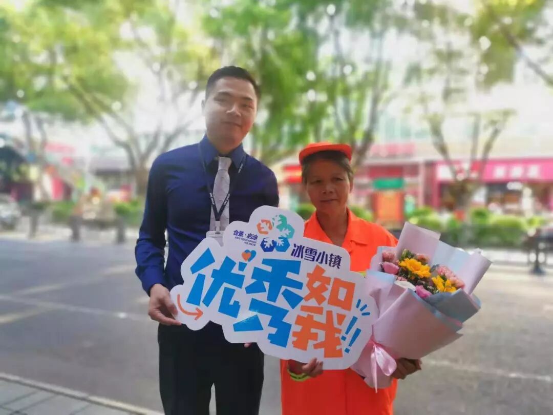藉新中国成立70周年,为了回馈更多的梧州市民,今天早上,合景·启迪冰雪小镇,给梧州那些坚持奋斗在一线的人献上一份冰雪之礼,为梧州市各行各业的工作人员送上鲜花与冰饮,并送上温暖的祝福。