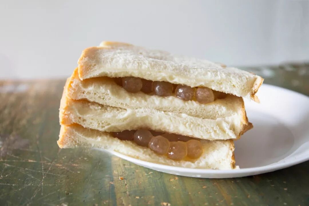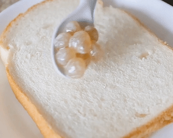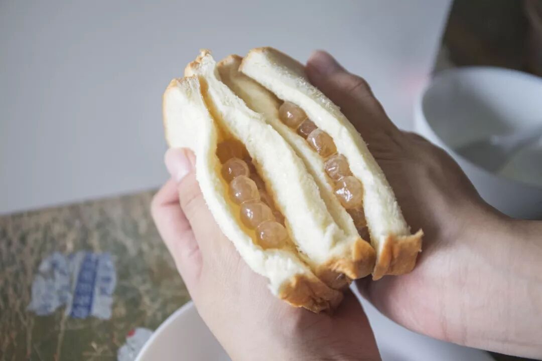 直接把分离好的珍珠放在吐司上,再盖上一片吐司就制作好啦,如果有兴趣可以尝试下加入芝士片煎一下这种更高级的做法。