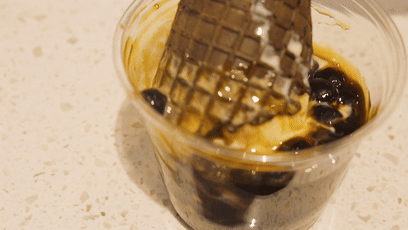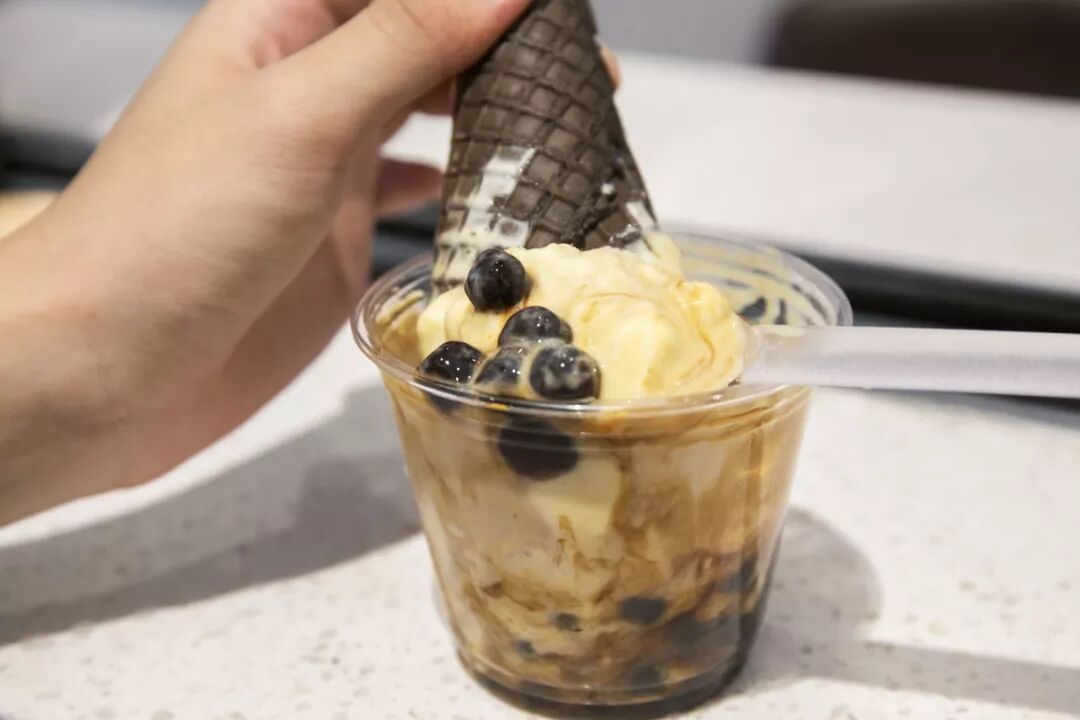 准备一支喜茶的茶王甜筒以及一盒珍珠,将甜筒插入珍珠中,一份味道颜值并存的珍珠奶茶冰淇淋就Get啦!相比直接来一份黑糖啵啵冰还省了一笔~