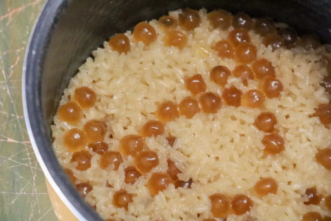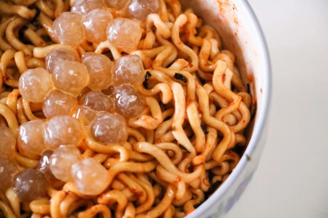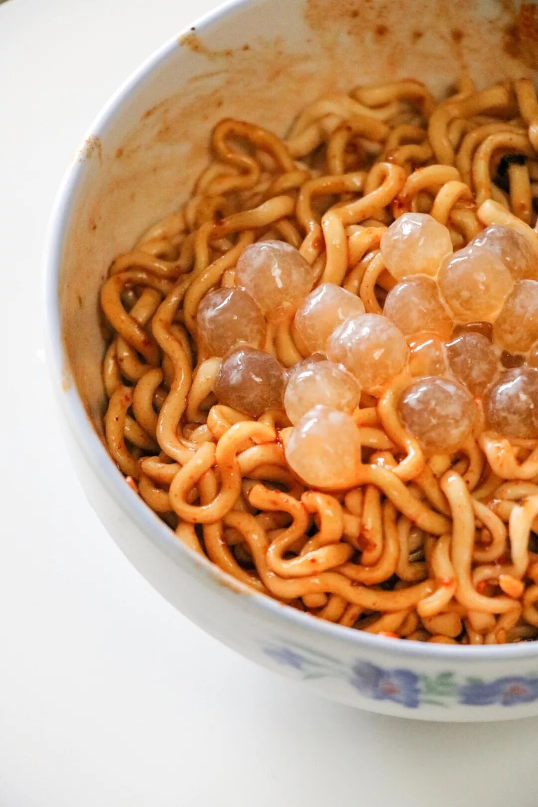兔子本着提高匹配度的原则,挑选了酱汁本就是甜口的火鸡面,先将干拌面照常用水泡开做好,最后将之前分离好的珍珠加入,继续拌匀之后就可以吃面啦!