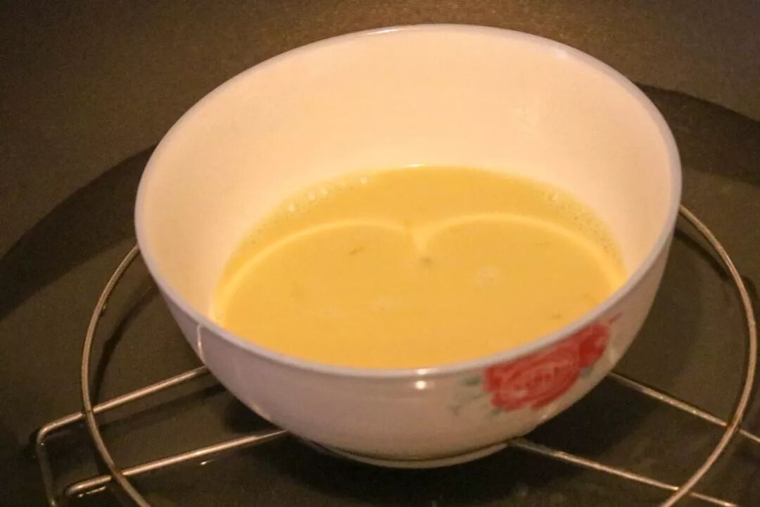 在打好的鸡蛋中加入些许奶茶,端入蒸锅静候出炉就好啦,进锅前明明还很正常呐!