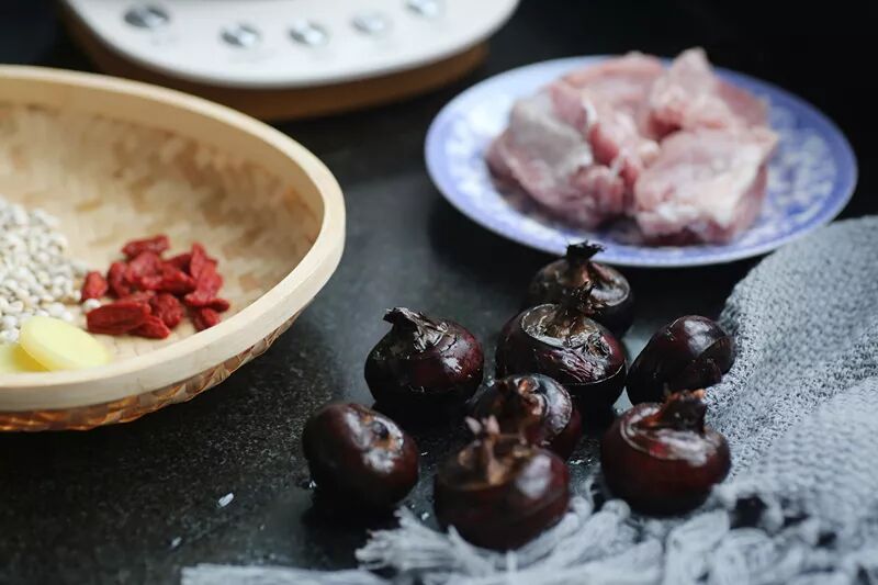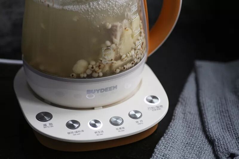 排骨洗干净放姜片焯水,洗净备用。马蹄去皮切片,其它原料洗干净,加入养生壶,加水1200ML。