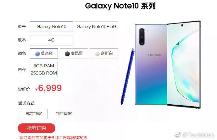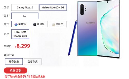 发布会会,三星中国官网也正是开启了三星GalaxyNote 10系列的先行者计划。目前三星中国商城有三星GalaxyNote 10 8GB+256GB及三星GalaxyNote 10+ 5G 12GB+256GB版可供抢购,售价分别为6999元和8299元,颜色包括莫奈彩、麦昆黑与密斯白三色。标准版将于8月21日开始发货,5G版则将发货时间定在了9月5日。