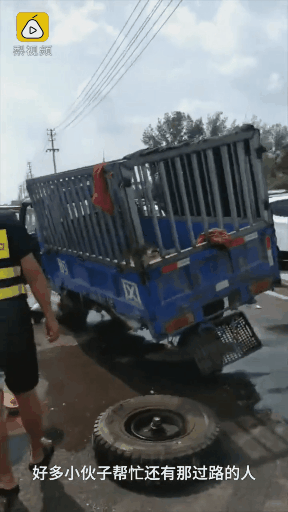 此时,一位开私家车的好心人路过,找来绳索帮他们拉车去修。没想到,农用三轮车重新起步,刚走了不到20米,左后轮脱离,整个车侧翻在马路,车上5000多斤西瓜滚落一地。