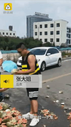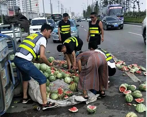 烈日当头,看着整车西瓜散落一地,把马路都给堵了,夫妻俩一下子慌了神。