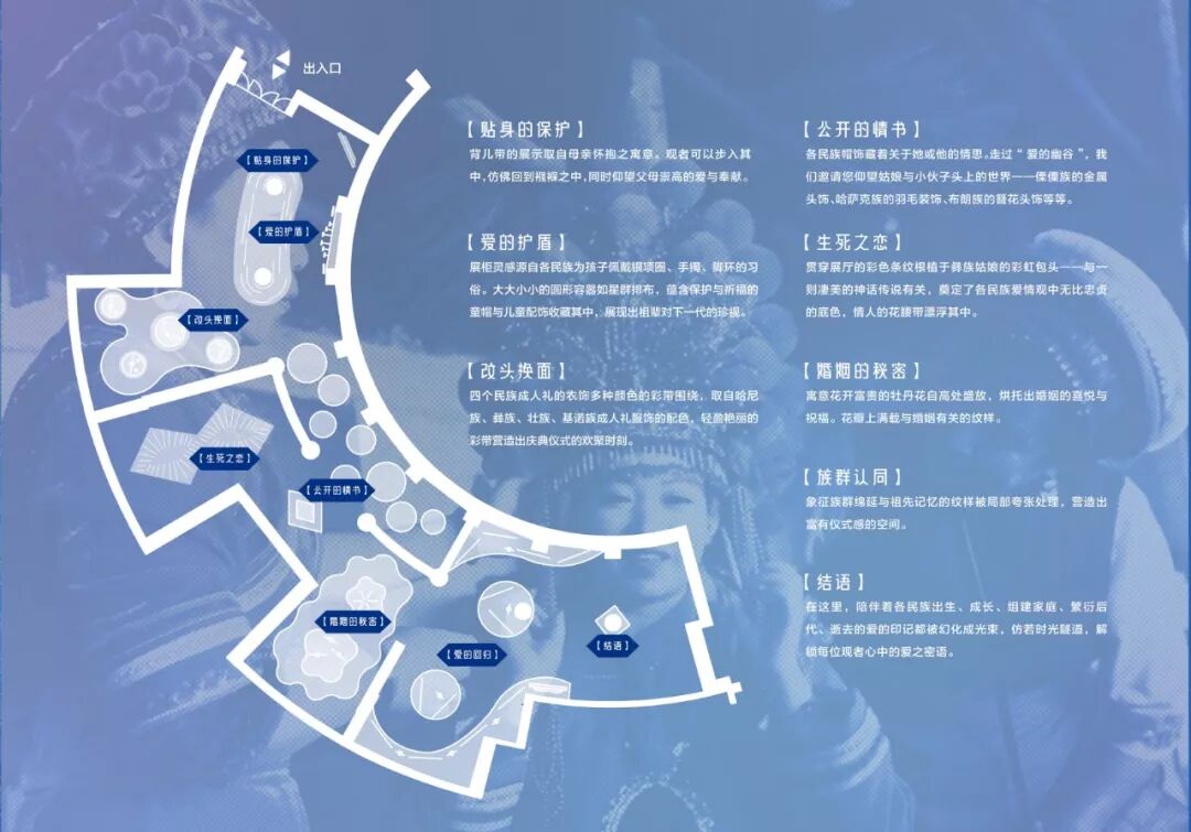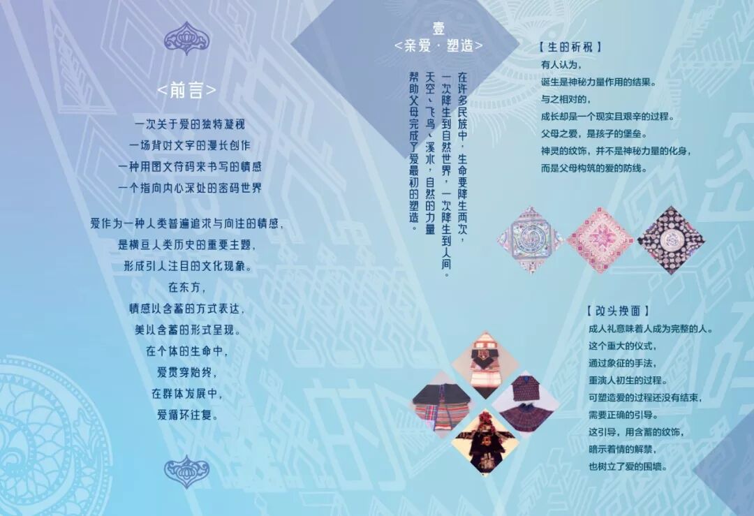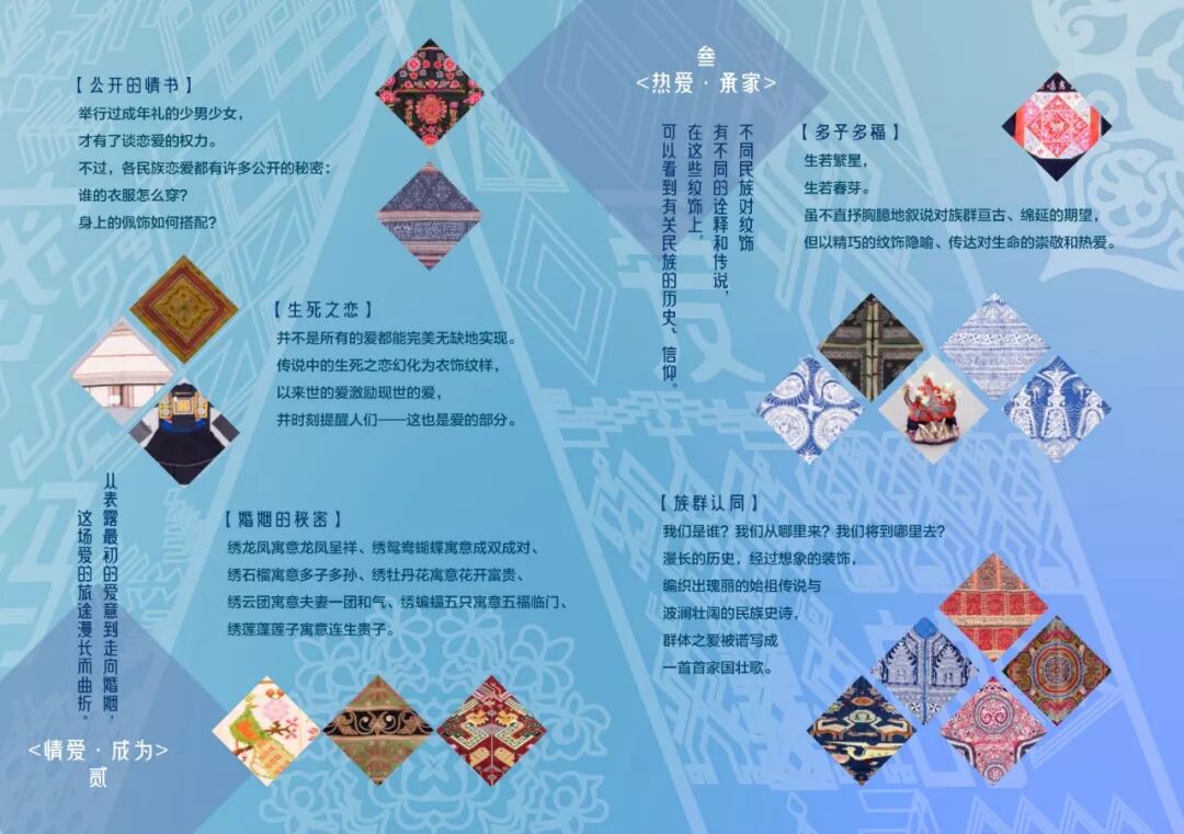 在对民族纹饰进行广泛搜集与深入研究的基础上,《爱的密码—民族纹饰展》通过集中展现运用神奇想象力和独特思维方式构筑起来的符码世界,引领观众把对“爱”的探究变成一场对中华各民族心灵世界和历史文化的视觉触摸和深度认知,并揭示出这些爱之密码作为民族文化DNA对于当代中国人实现文化创造性转化和创新性发展的灵感源泉的珍贵价值。