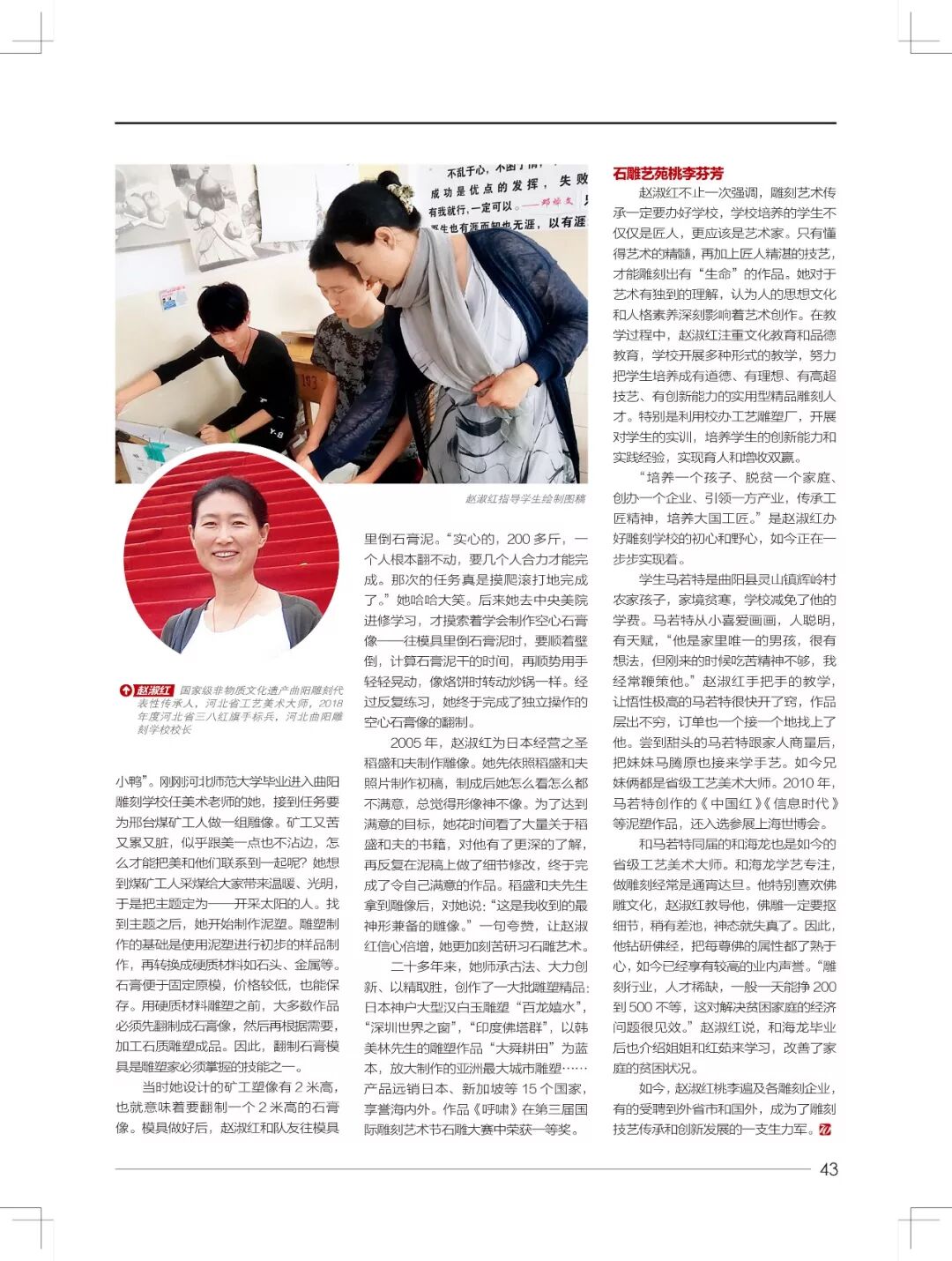 - 左右滑动查看更多 本文刊于《中国妇女》7月上 27年,赵淑红传艺授业,只为传承和发展中华石雕技艺的代表——曲阳雕刻。大匠精神,桃李无言,都镌刻在遍及海内外的曲阳石雕作品中。 一块冰冷的石头,集天地