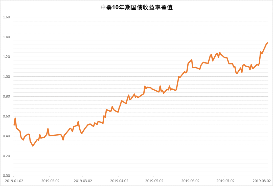 中国债券市场由于和全球关联度较低,因此是很好的分散风险的资产。在全球降息、债券利率下跌的同时,中国10年期国债和美债利差不断攀升,8月7日已达134bp。