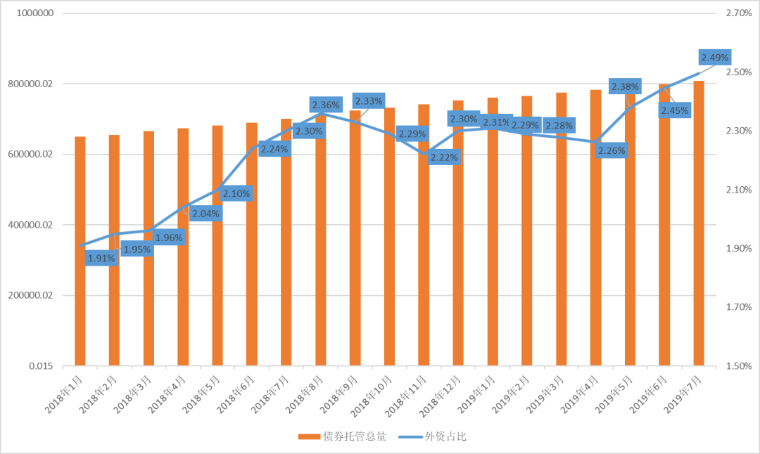 - 点击 人民币交易与研究 关注我们↑↑↑ 外资继续“攻占”中国债券市场,7月持有总量超过2万亿元,较6月上涨3.17%,外资在中国债券托管总量中所占比重达2.49%,连续3个月上升,并创历史新高。其中债