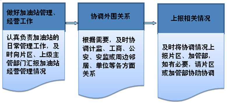 7. 负责加油站外部经营环境的建设工作。向上级主管部门汇报加油站经营管理情况,协调当地政府职能部门维护油站利益。