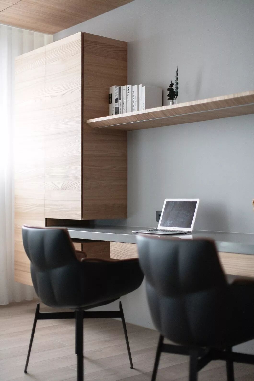 组合柜与书桌组成一个整体,在满足了储藏功能的同时提供了装饰性,整个空间的舒适体验在此展开。