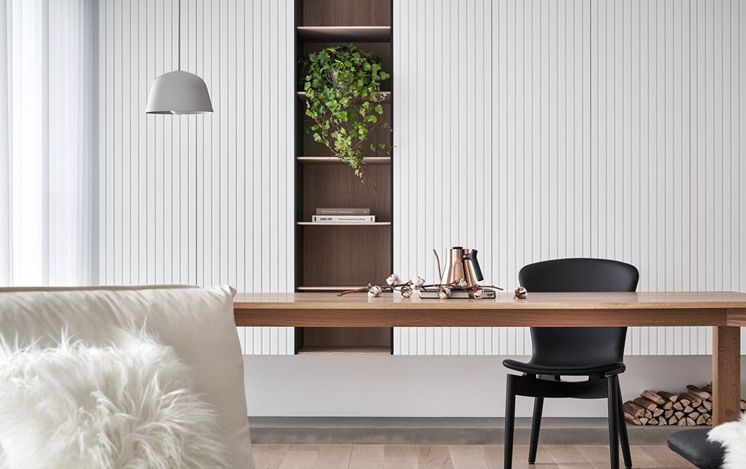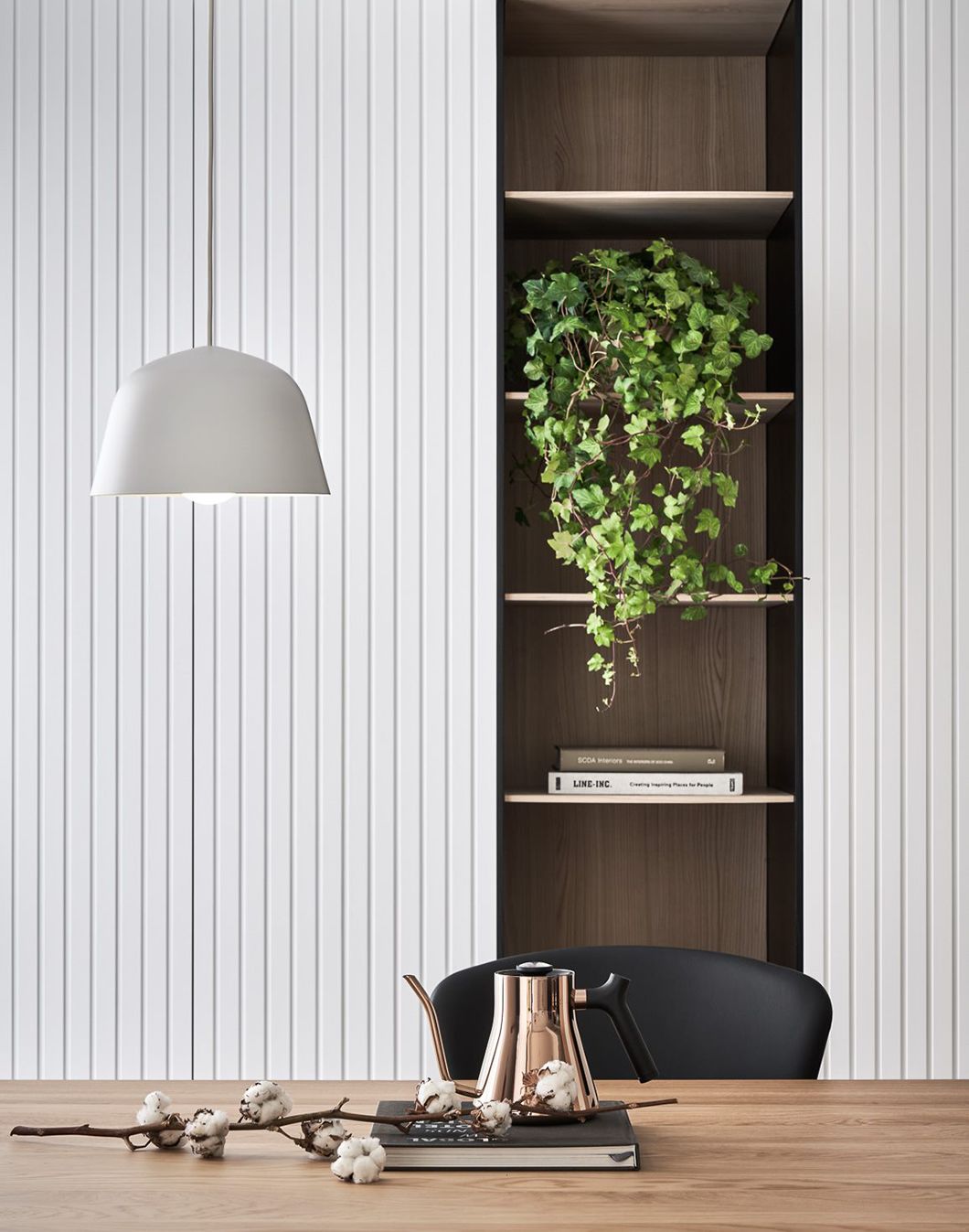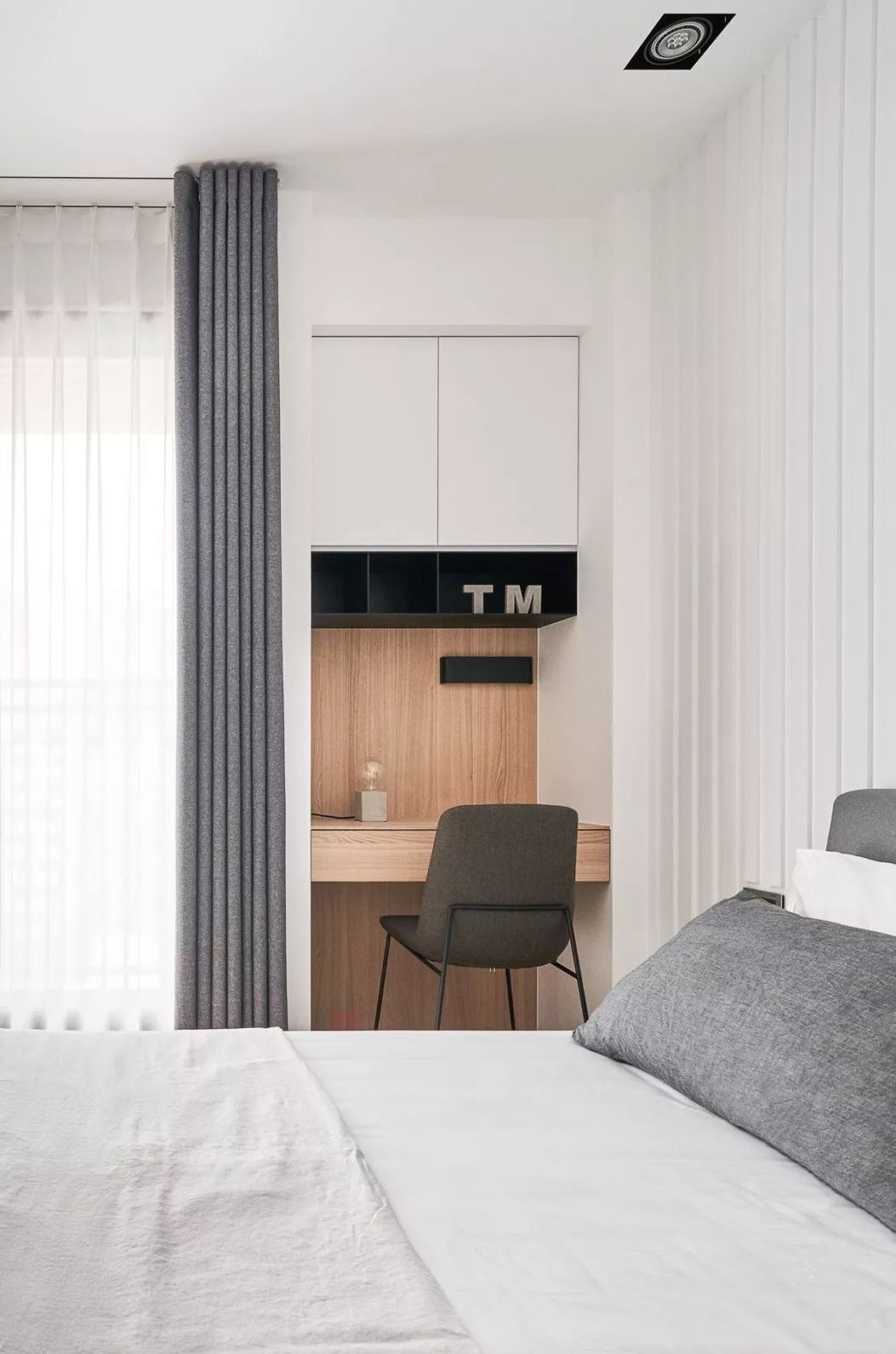吊顶运用了木饰面拼贴,木质天然的条纹形态为空间增加了延伸感,扩大了空间视觉氛围,定制的书桌以插进柜中的形态展现,增加了空间的趣味性,为简单的空间结构增添了一丝变化。