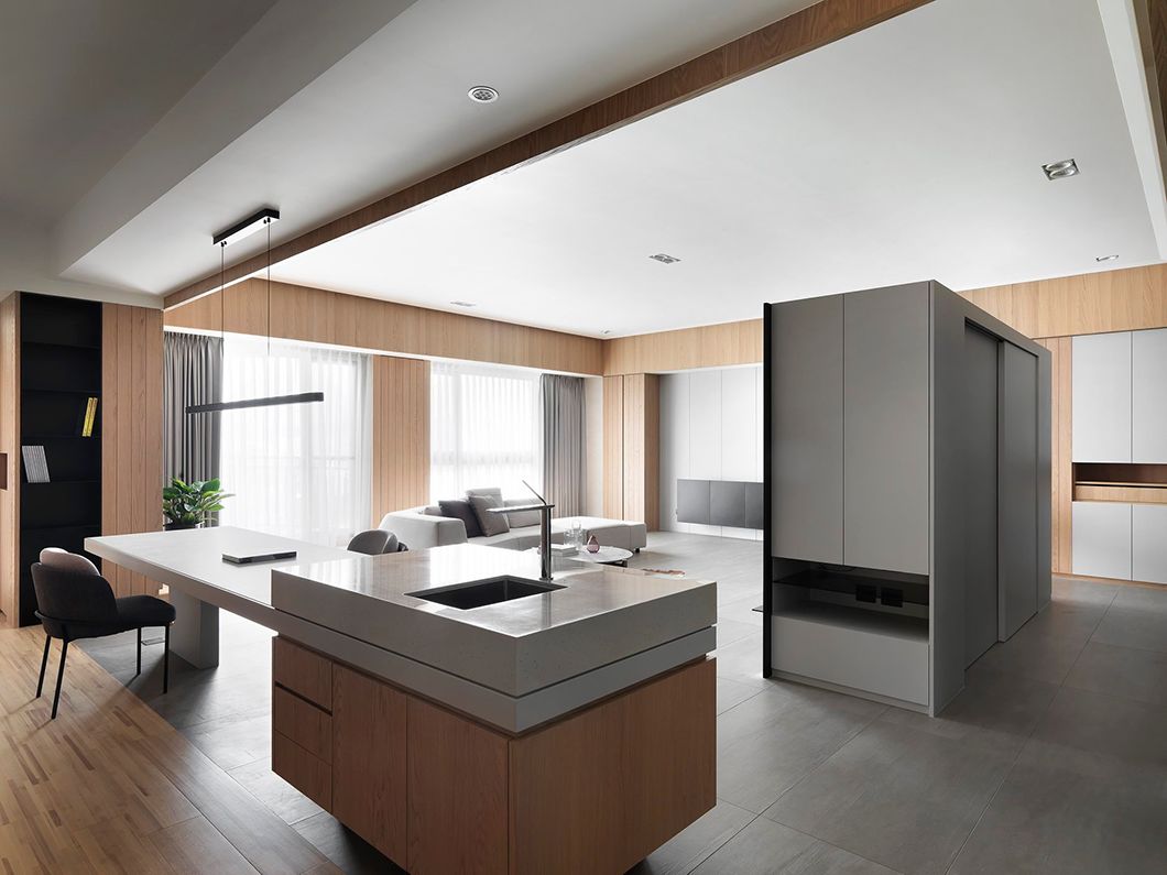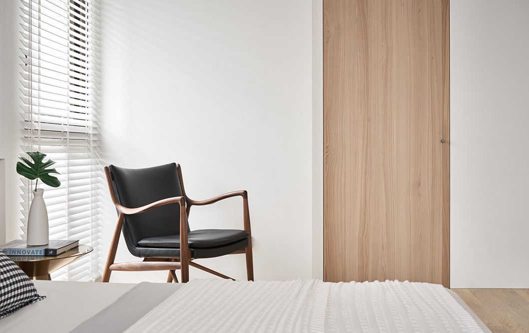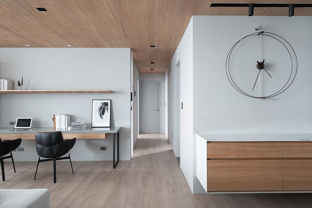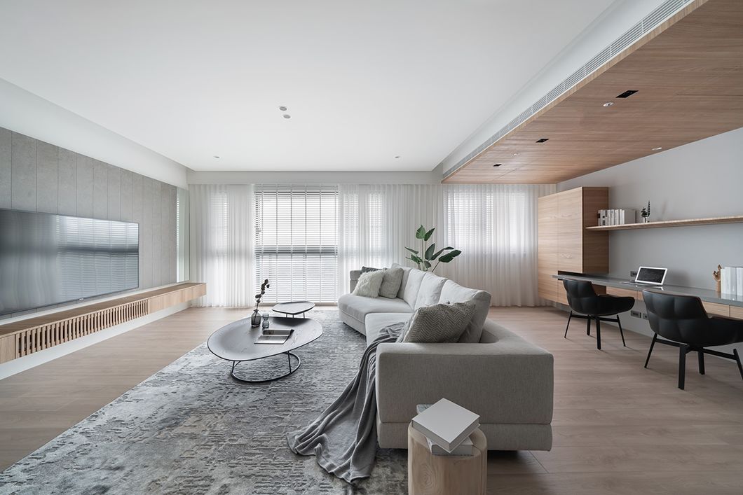 空间色彩以白色为底蕴,包容着浅色木纹纹理、沉稳的清水模涂料相互作用于空间内,木质纹路清浅带出自然质感,为全室以白色机调的空间添一分温柔感受。
