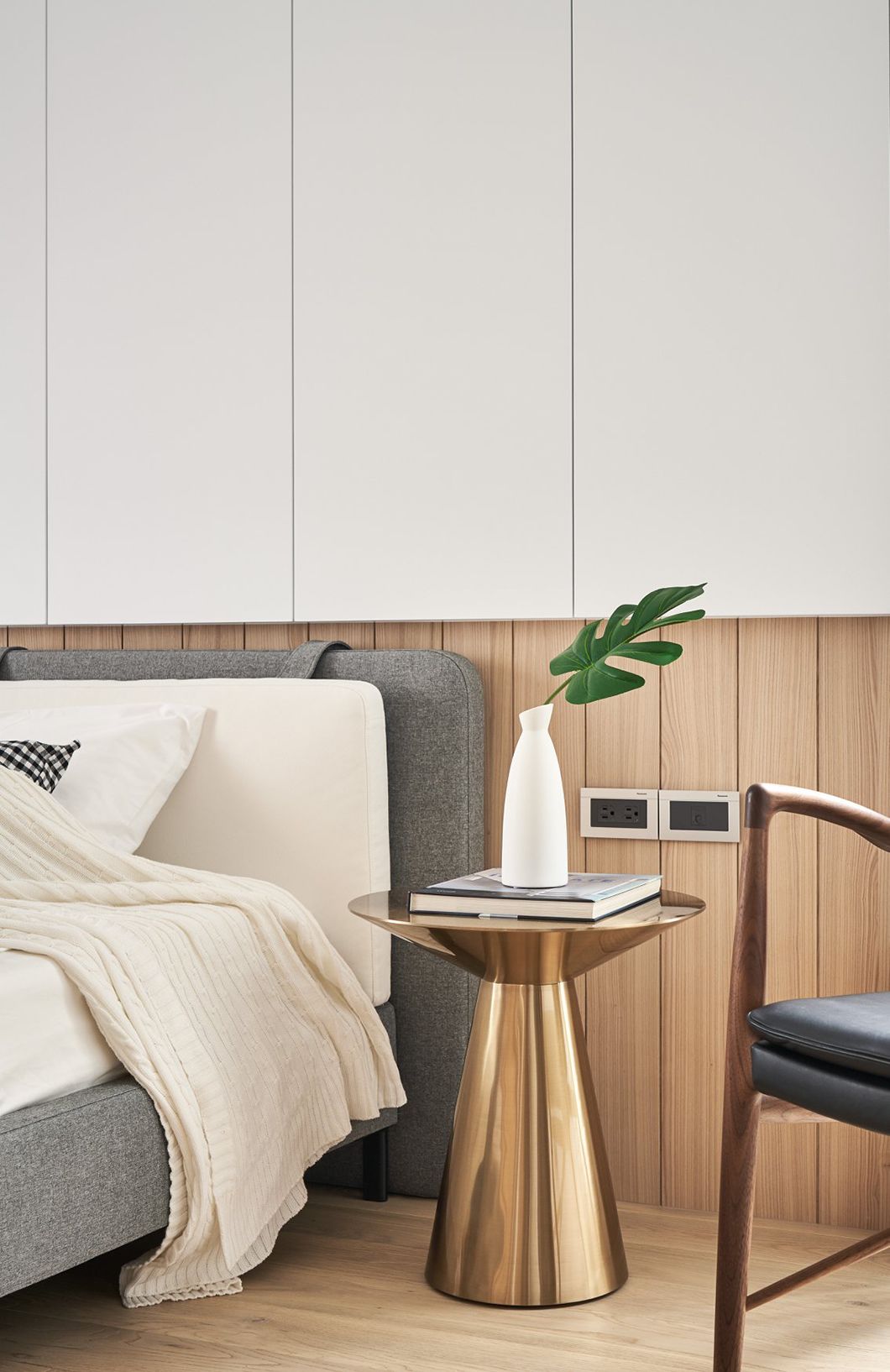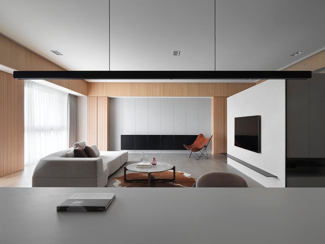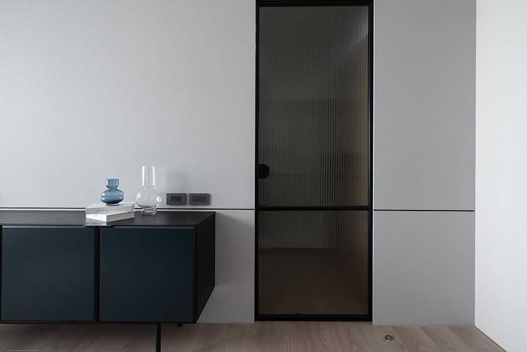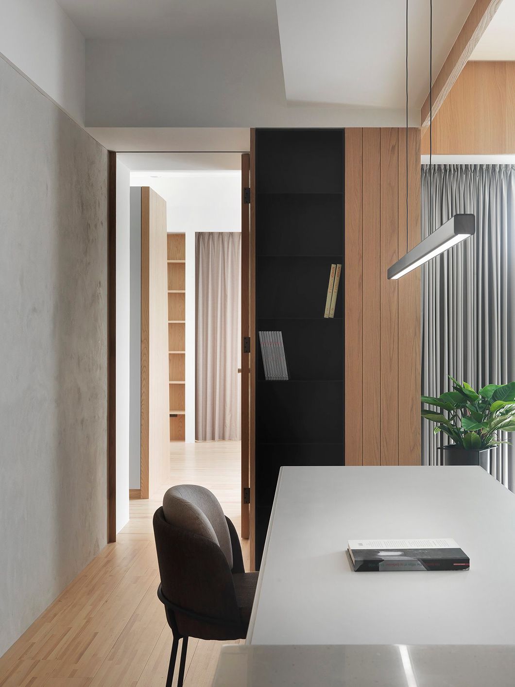 空间色彩以白色为底蕴,包容着浅色木纹纹理、沉稳的清水模涂料相互作用于空间内,木质纹路清浅带出自然质感,为全室以白色机调的空间添一分温柔感受。