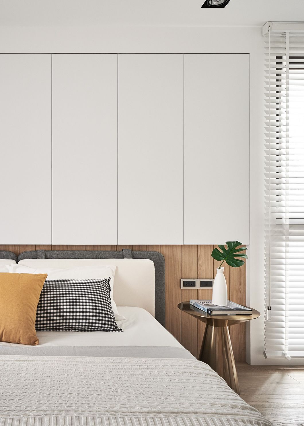 卧室使用了灰白色,颜色淡雅温馨,没有使用过多的颜色与造型,让空间回归最初形态。床上灰色的床搭搭配毛绒抱枕,安逸而舒适地铺陈,似乎在强调空间的睡眠属性。