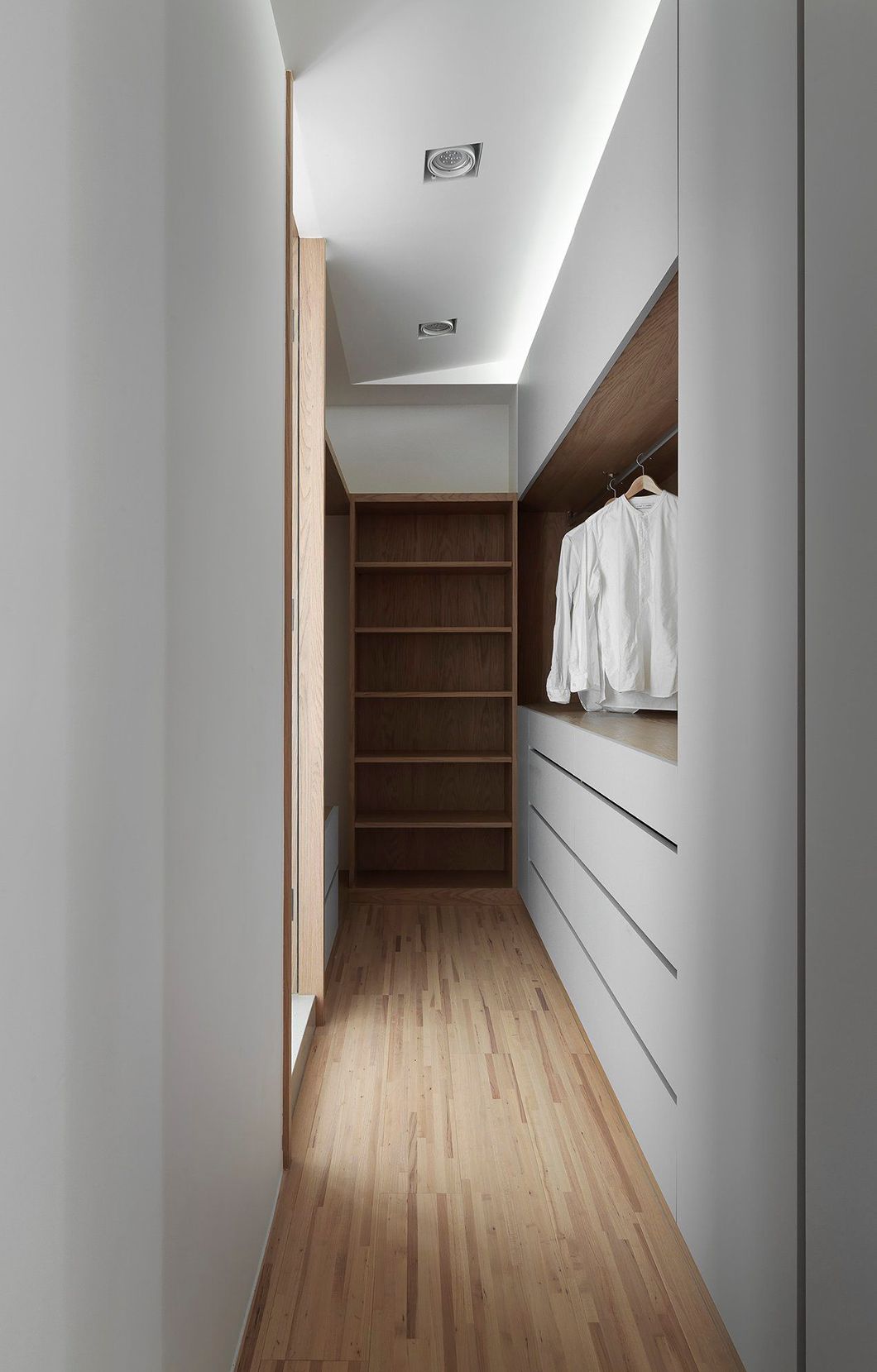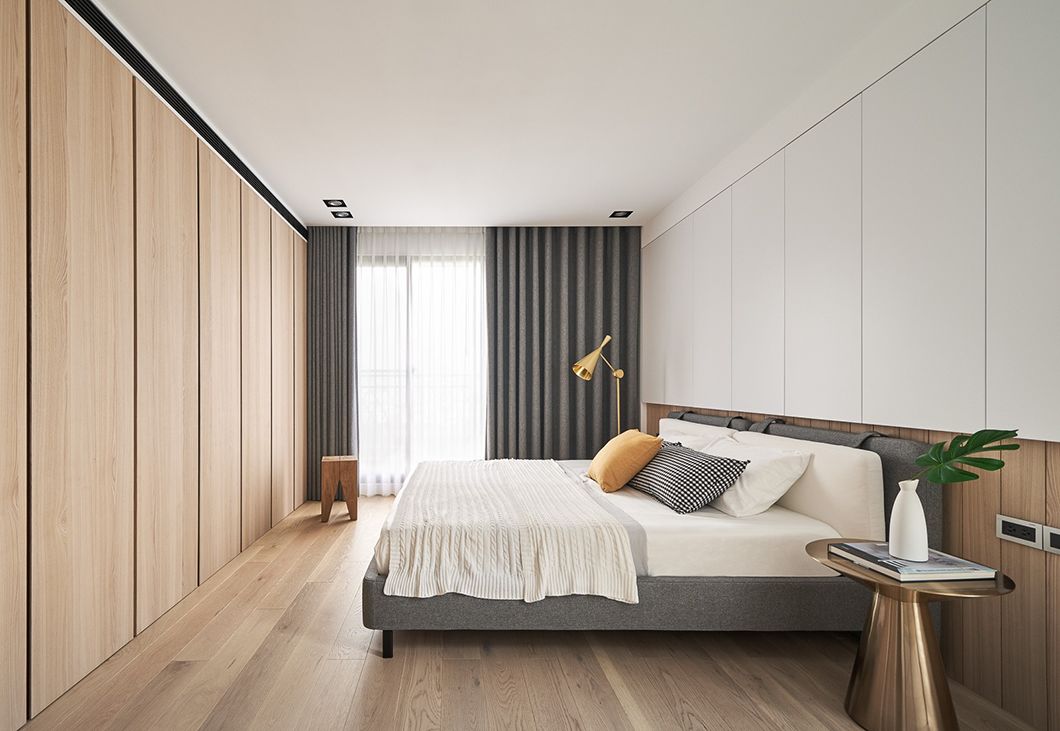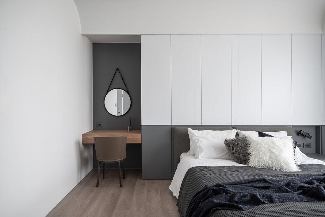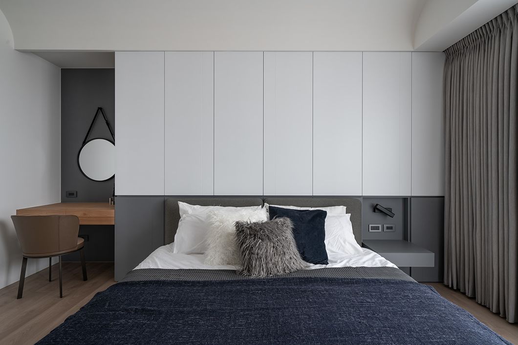 在设计上设计师打破原本的空间局限,卧室墙体配合屋顶斜度被切割成梯形,因主人喜欢看书,设计师设计了大面积的书柜与书桌,同时也可为女主人提供化妆空间,卧室内大面积的落地窗提升了空间机能性,让光与气流的穿透有更佳的连通度。