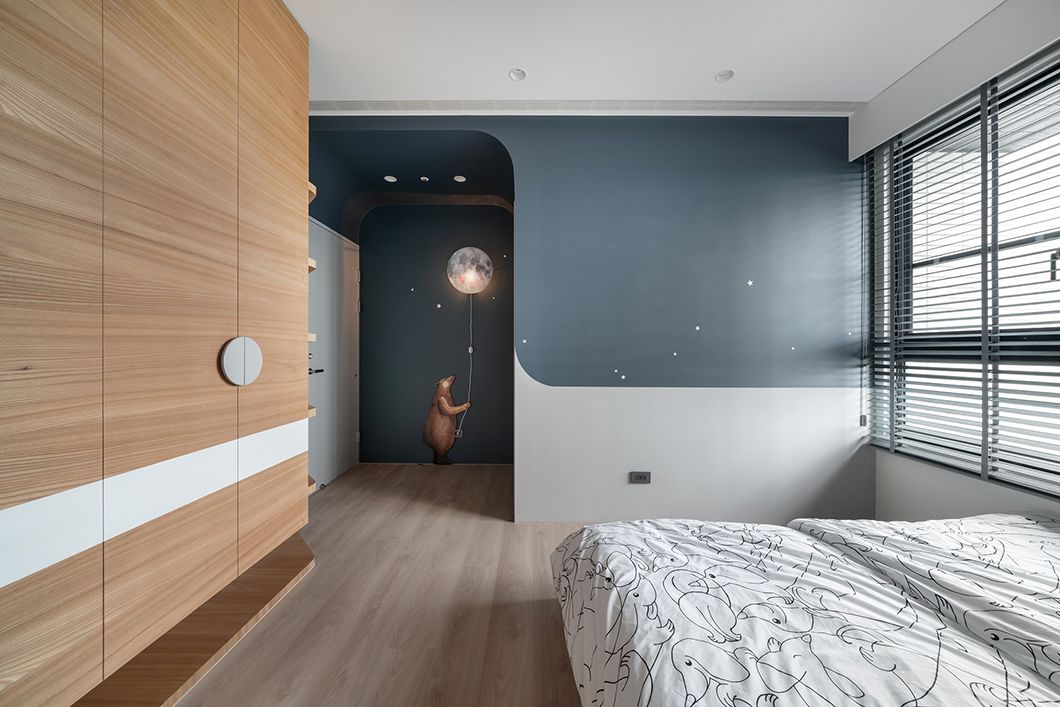 在儿童房的设计中,设计师巧妙的把童趣与自然相结合,原木色家具中融入很多孩子喜欢的元素,比如小熊图案壁纸,月亮壁灯,毛绒抱枕等,满足实用性的同时大大增加空间的趣味性。