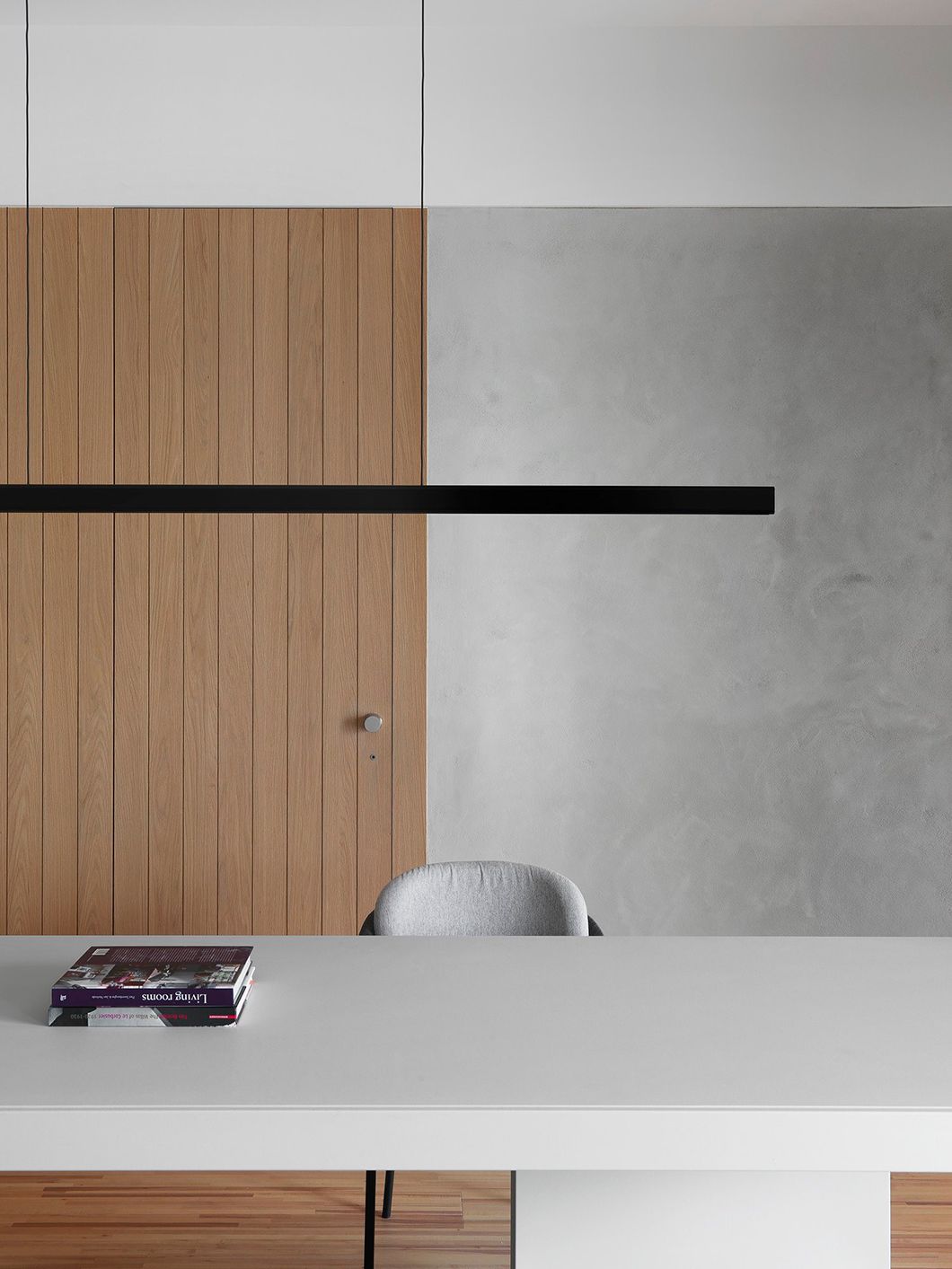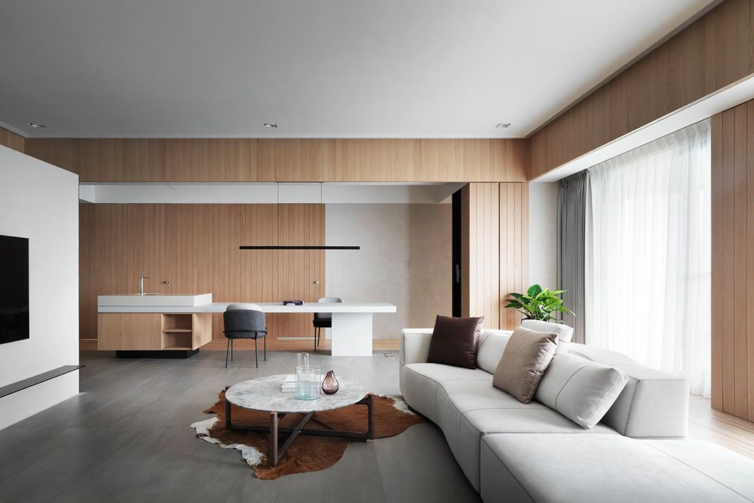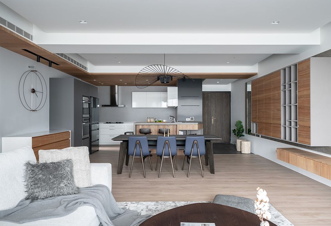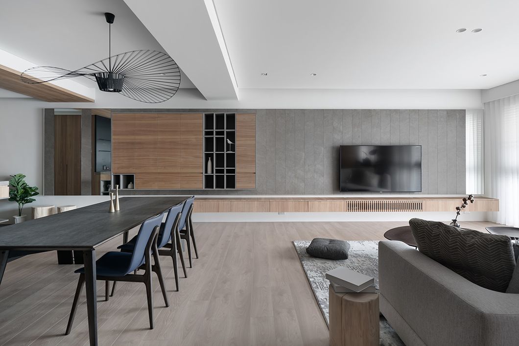 灰色与木质的结合,使得空间通透明亮,简洁的现代家具巧妙地缀于空间,为其增添生活温度。顷刻之间,整个场域取得微妙平衡。