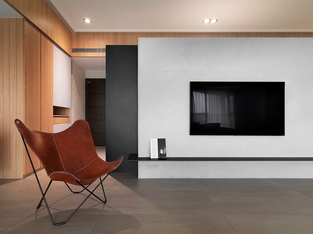 客厅使用仿水泥瓷砖 ,质感的灰色让基底沈淀出素朴的材料表情。
