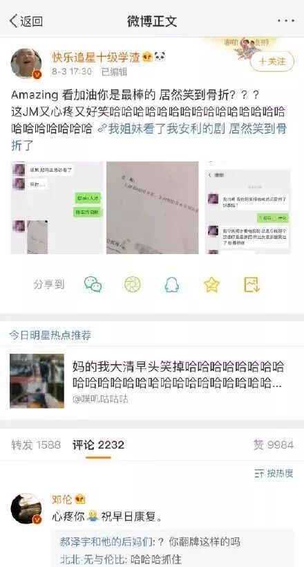 但是最近看到一条热搜 #邓伦回复笑到骨折的网友# 本来还在感慨现在这营销手段真是层出不穷。