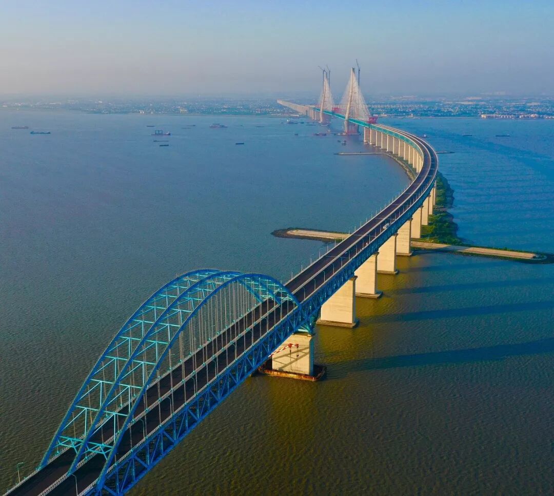 沪通长江大桥全长11072米,主桥长2296米,主跨1092米,为国内最大跨度斜拉桥,也是世界首座跨度超千米的公铁两用斜拉桥。主塔高325米,为世界上最高桥塔。